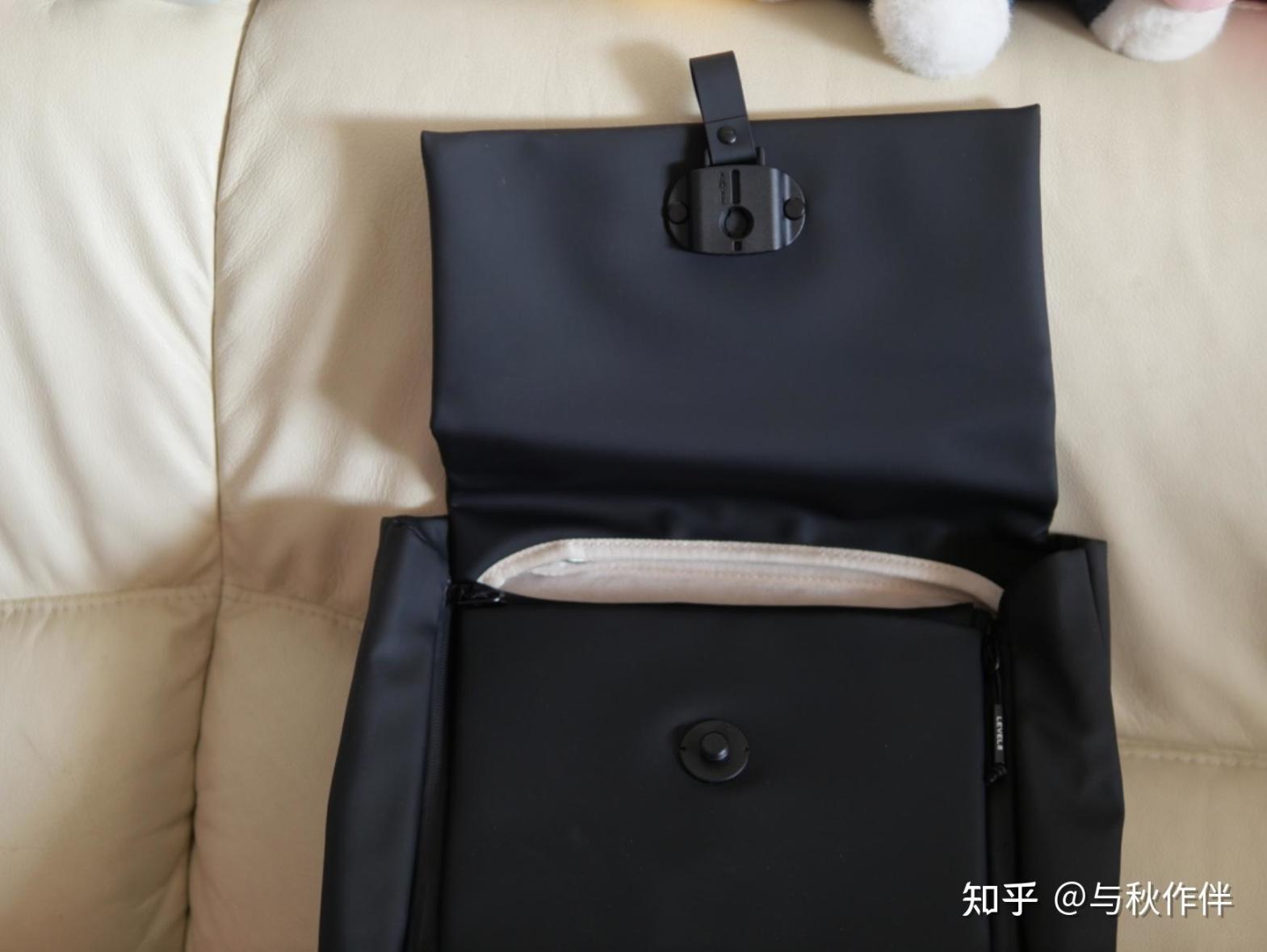 这款包的特点就是非常耐用,表层材料使用的环保素皮,触感亲肤,外表面料耐刮耐折,可以达到4-5级防水,平时下个小雨什么都没问题,而且抗油污、好打理,脏了直接用湿毛巾擦一下就可以了。包的盖子是德国fidlock磁吸卡扣式的,正常怎么拽都拉不开,但是需要打开的时候往下一拉轻轻一抬,包就开了。