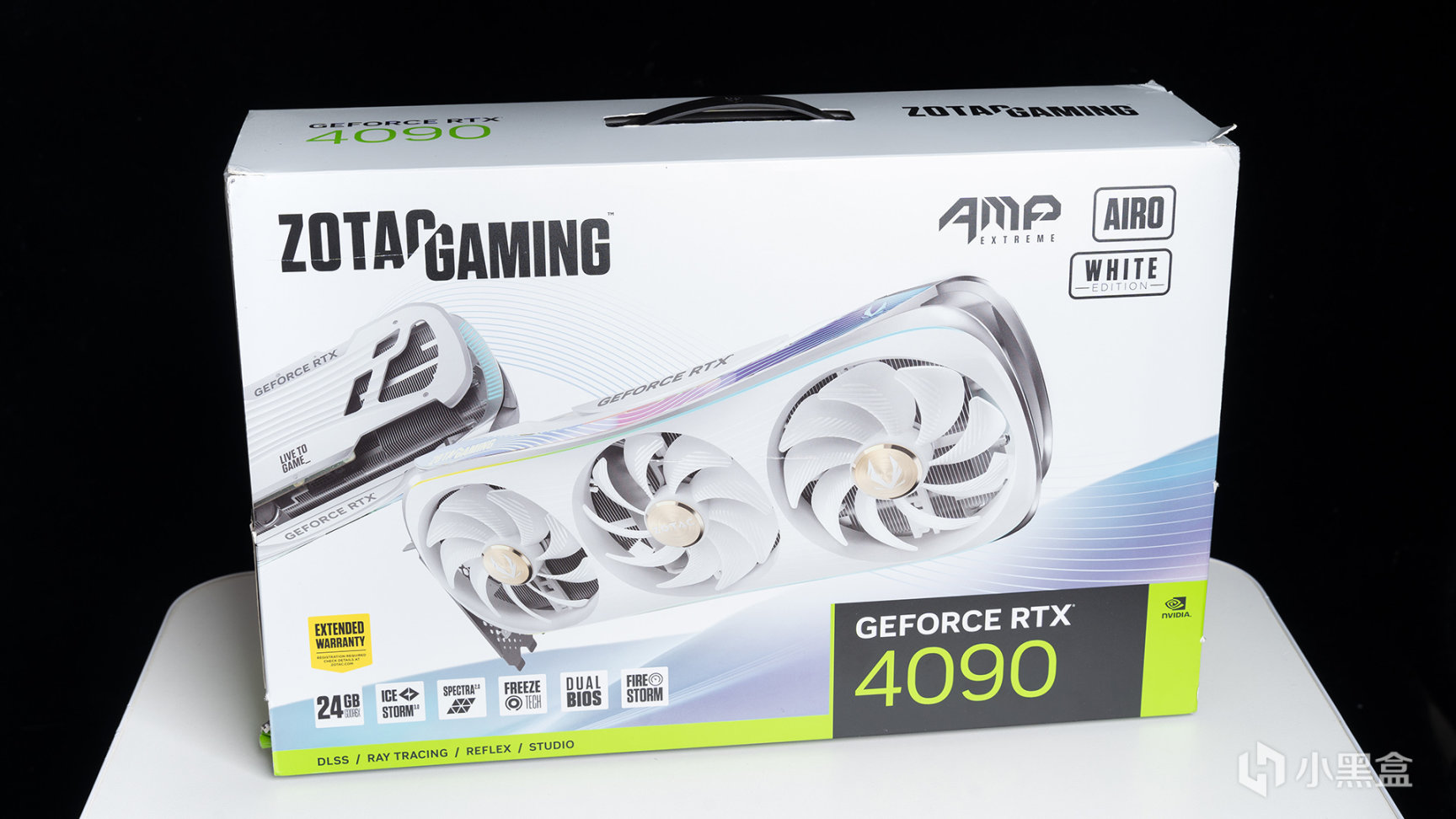 显卡选用最近缺货得很的RTX 4090旗舰级非公产品——索泰RTX 4090 AMP月白,至于为什么缺货就不用多说了吧,以后也不会上架了,毕竟会有替代品的,就让我们最后一次一睹芳容吧,包装采用和月白显卡相同的简洁白风格设计,下方有一些显卡特性介绍。