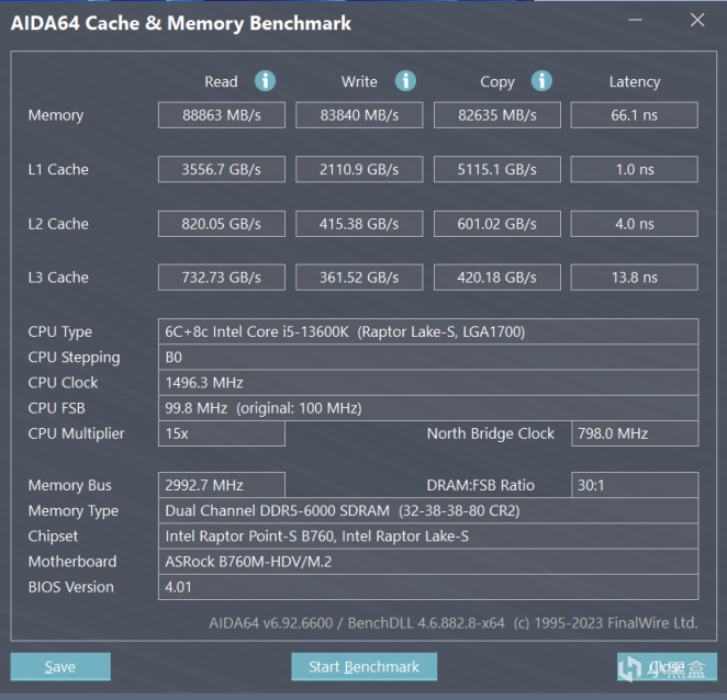 DDR5-6000C30-38-38-80 优化时序,AIDA64内存和缓存测试