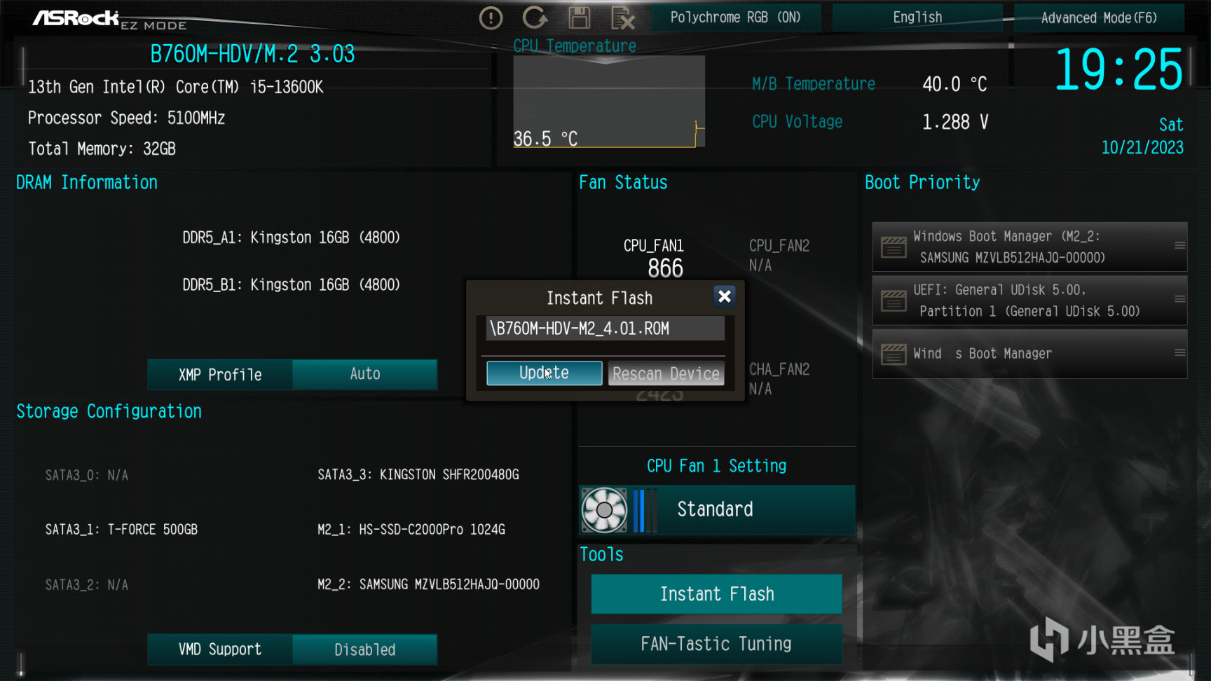 华擎B760M-HDV/M.2初始进入BIOS的EZ界面,整体功能区划分也挺清晰的,而个人比较喜欢华擎BIOS其中一个方面——在EZ界面直接选择一下Instant Flash,主板就能自动搜索U盘的BIOS文件了,在弹出的对话框中点击Update就会开刷,精简了重启再到刷BIOS的界面,非常方便。