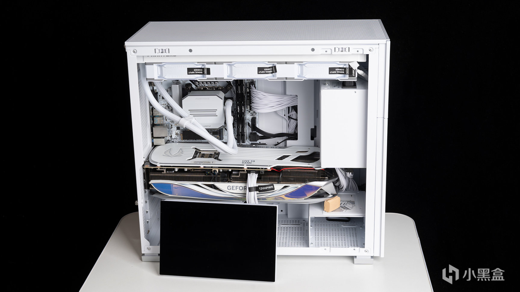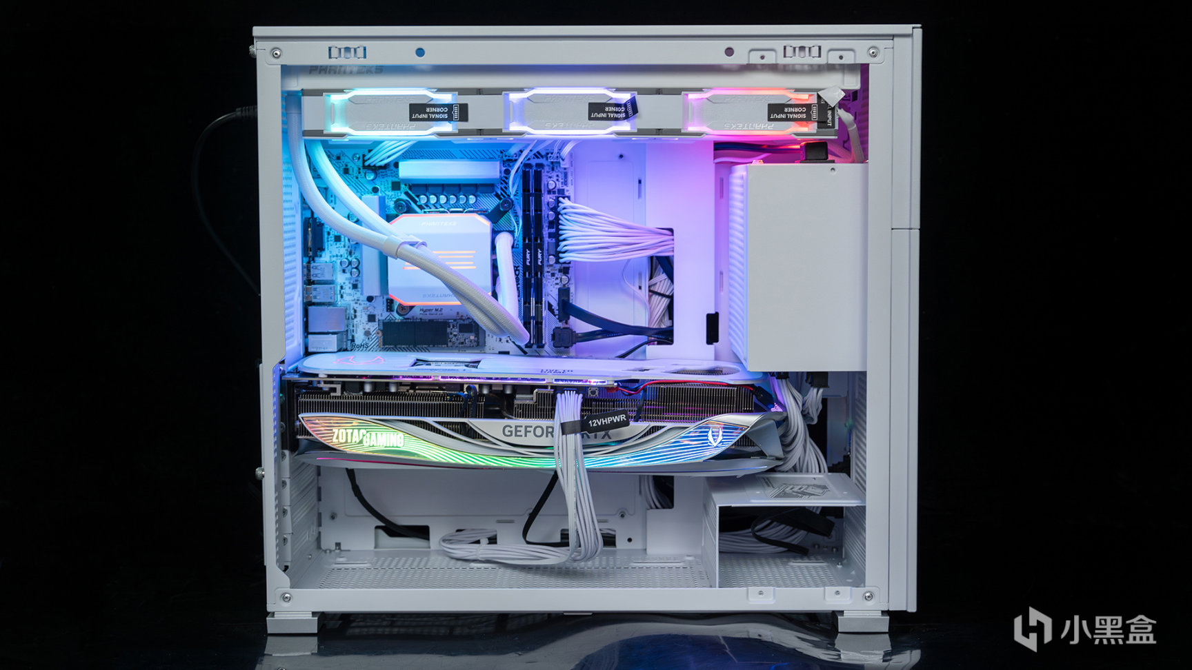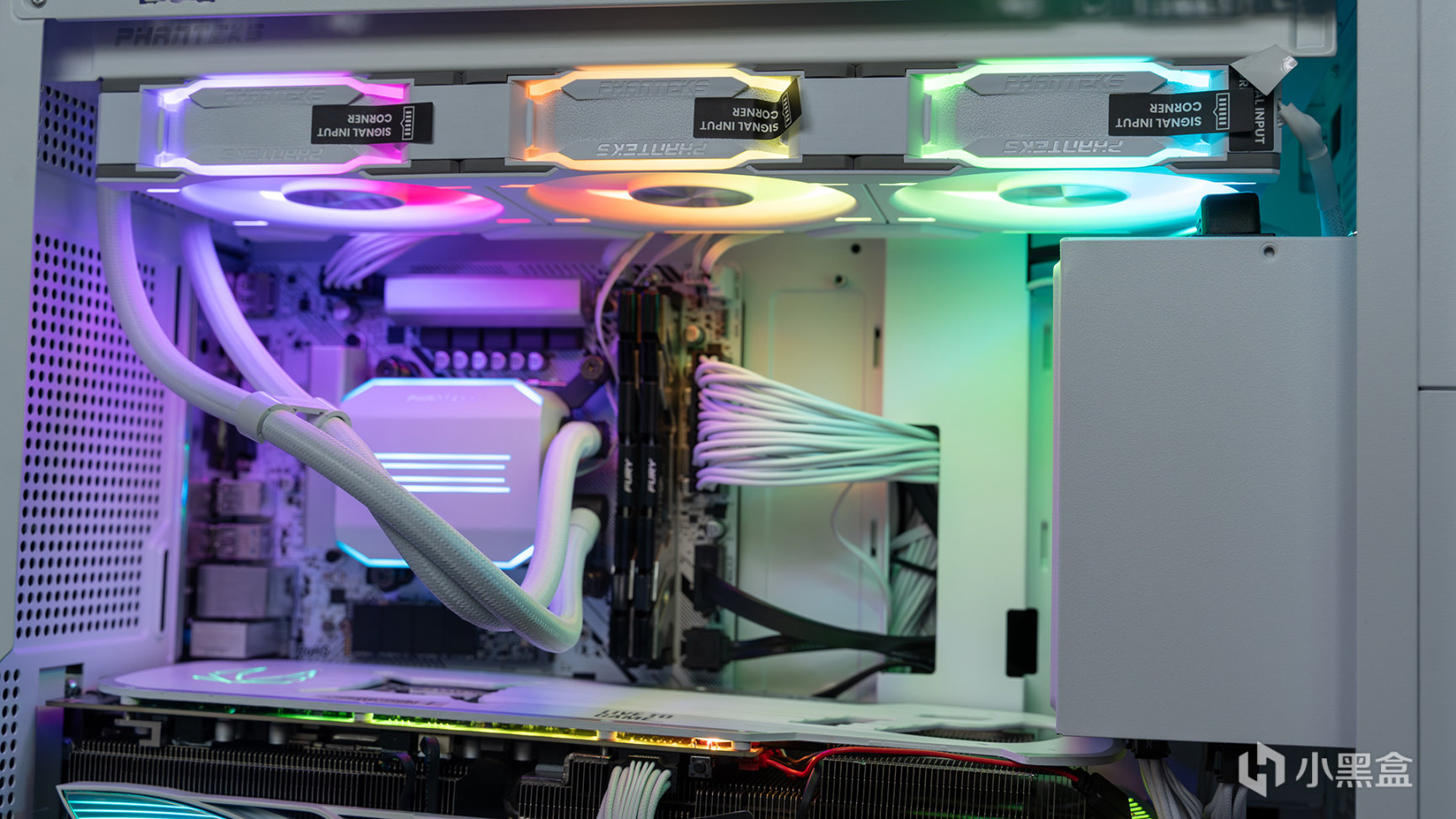 为了更好展示RGB效果,这里拆掉了挡板,整机RGB效果集中在水冷头、水冷风扇和显卡上,个人觉得恰到好处没有达到光污染的程度,RTX 4090 AMP月白长度虽然能兼容机箱,不过也只是刚刚好而已,背板部分还是会接触到电源模组接口,最好还是能预松一下显卡和电源长度。