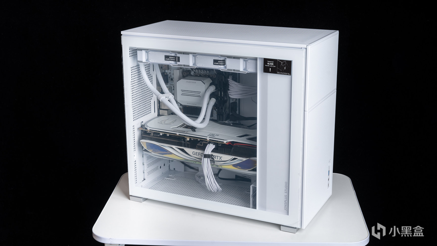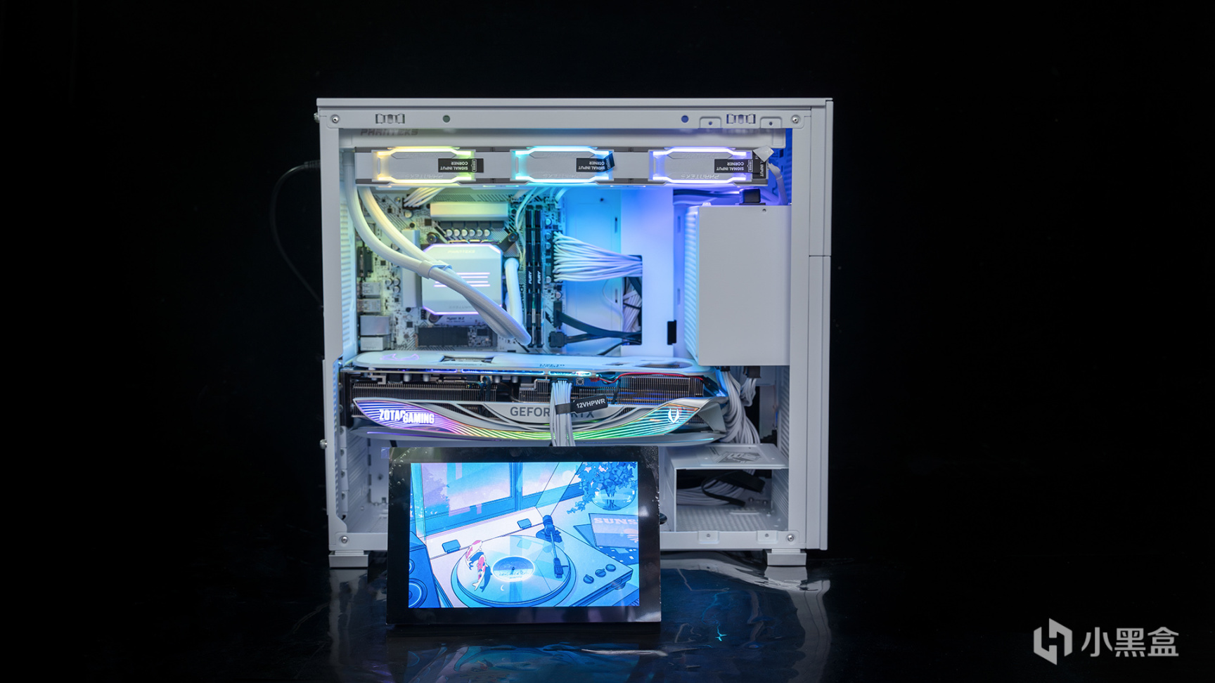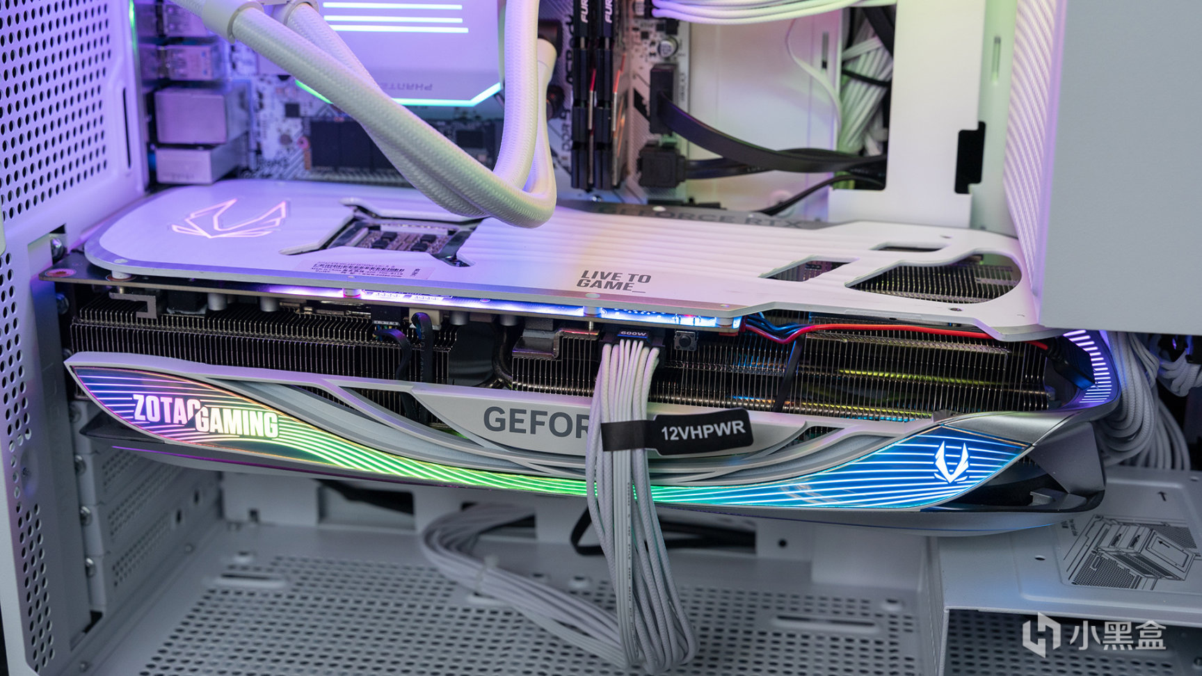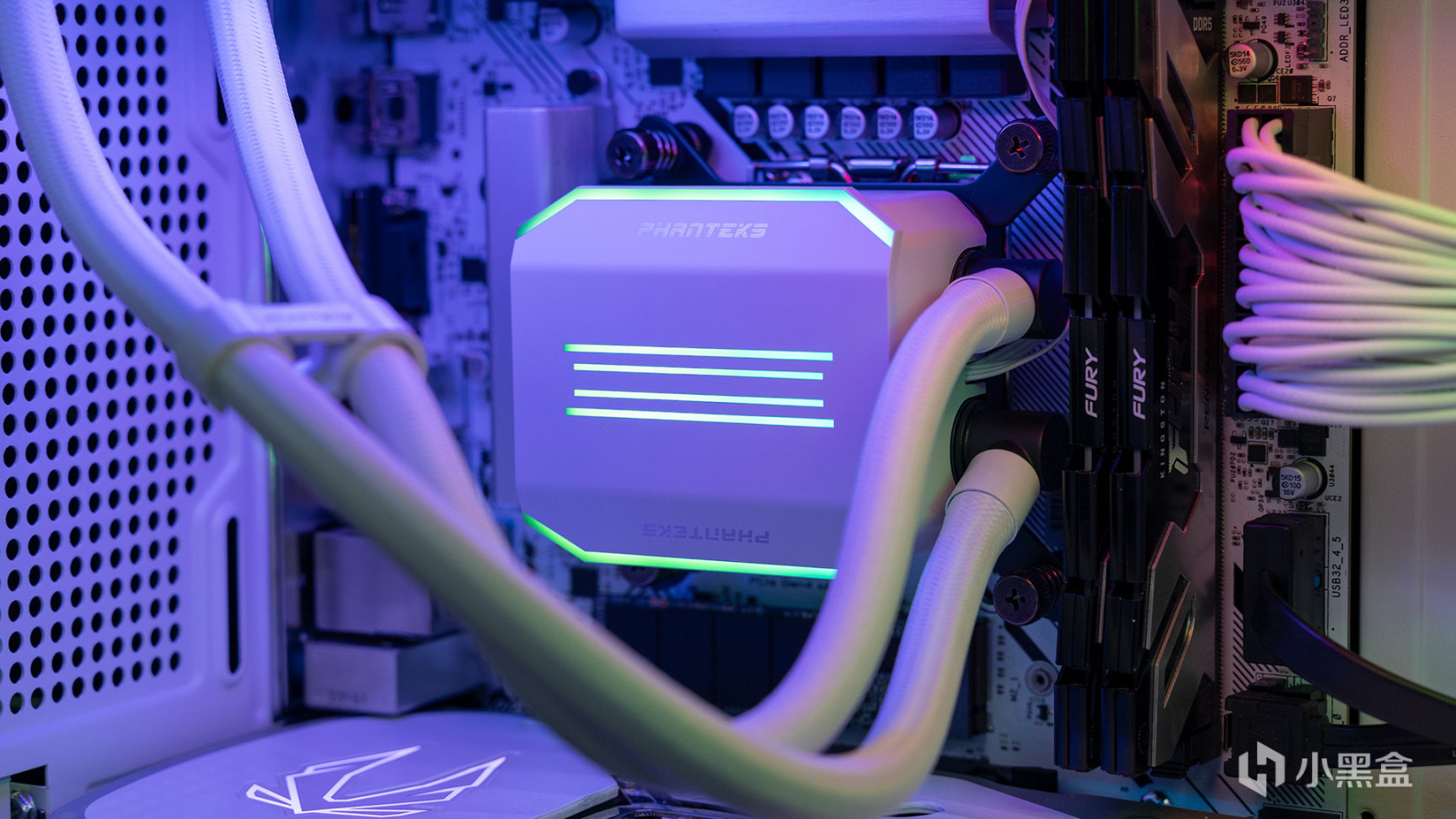 为了更好展示RGB效果,这里拆掉了挡板,整机RGB效果集中在水冷头、水冷风扇和显卡上,个人觉得恰到好处没有达到光污染的程度,RTX 4090 AMP月白长度虽然能兼容机箱,不过也只是刚刚好而已,背板部分还是会接触到电源模组接口,最好还是能预松一下显卡和电源长度。