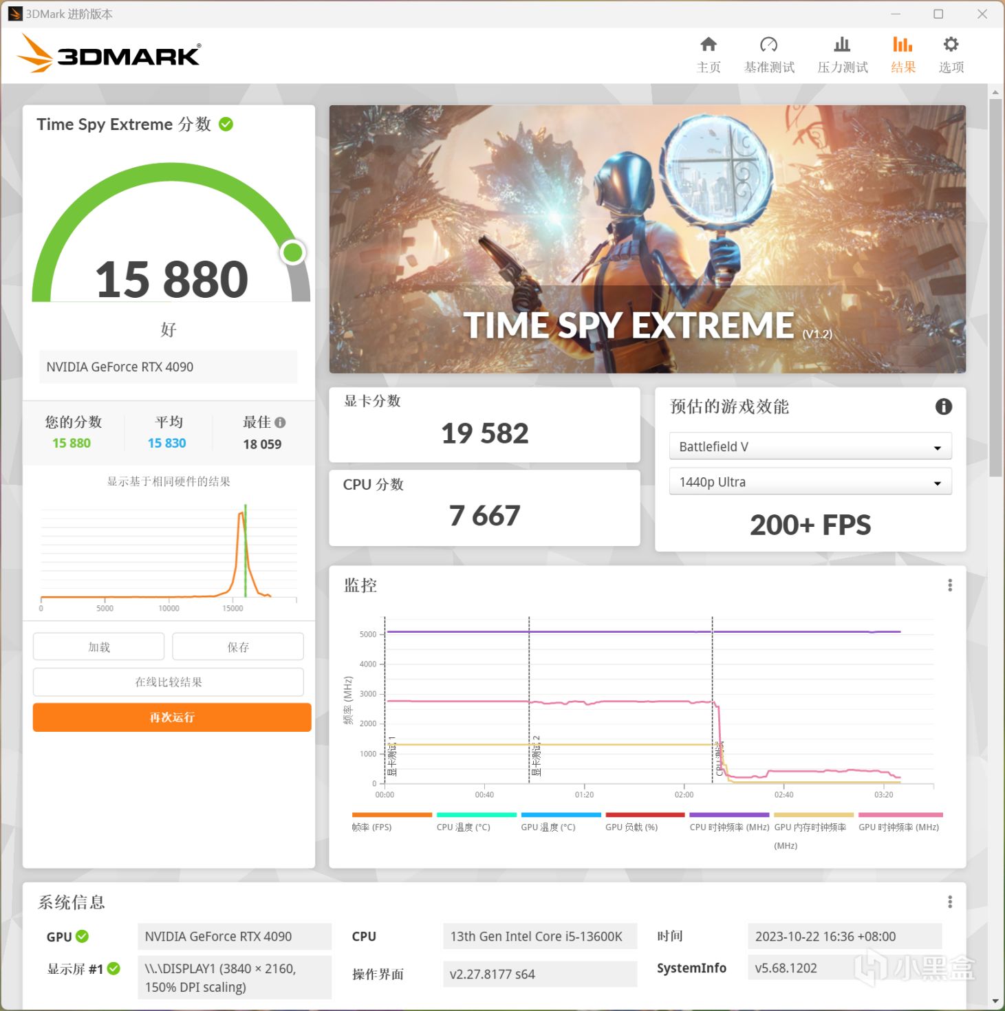13600K+RTX 4090 AMP月白,3DMark Time Spy EXTREME显卡分数为19582,CPU分数为7667