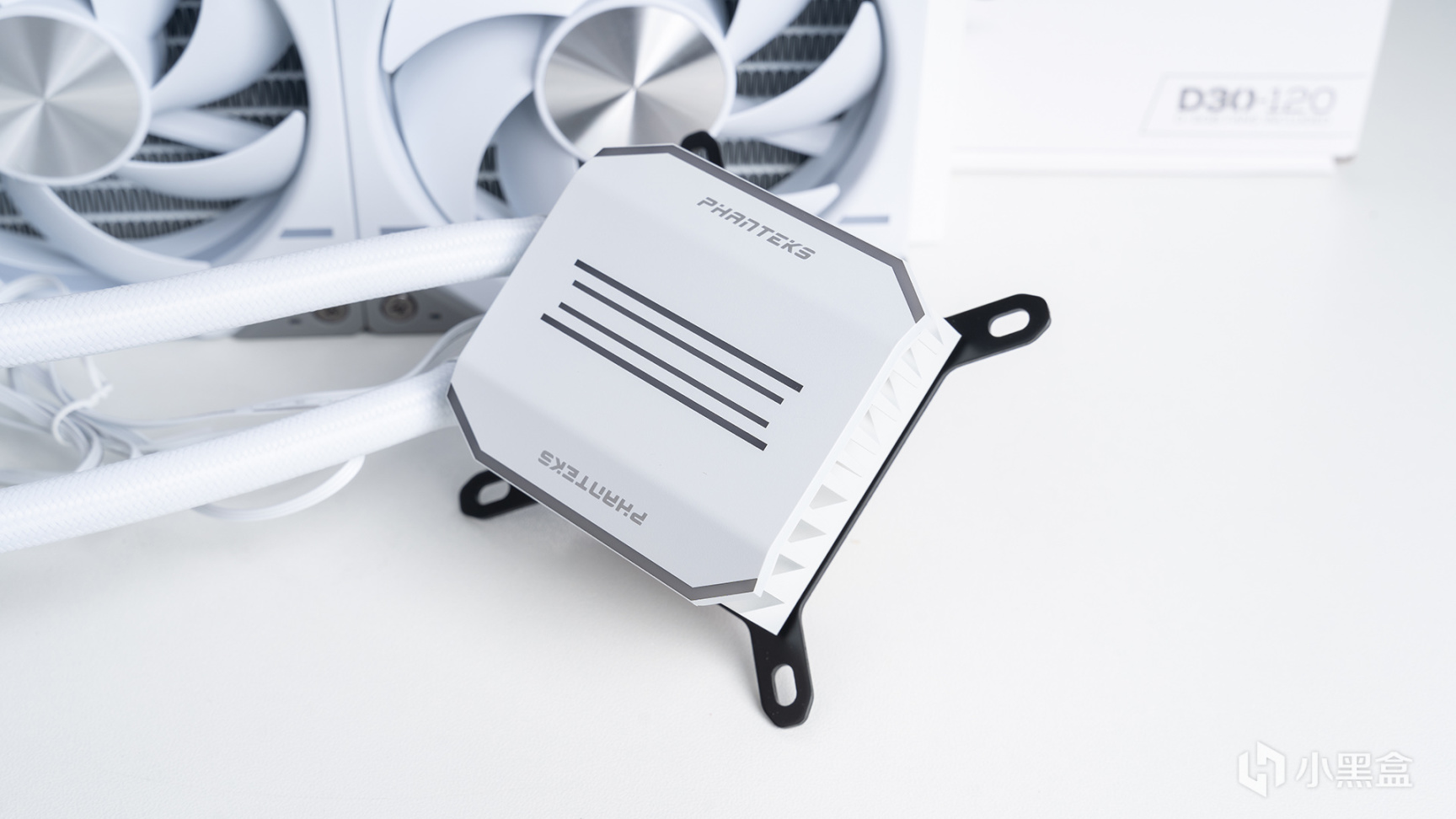 水冷头设计也很简洁,方形造型下有一些线状ARGB灯设计,内置是高性能自研的水泵方案,出厂状态已经预装了Intel扣具。