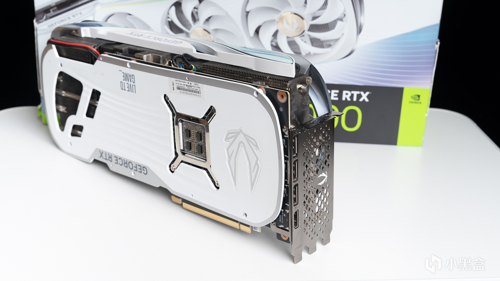 视频输出方面,RTX 4090 AMP月白采用3*DP1.4a和1*HDMI 2.1的标准接口组合,从PCI挡板角度观察,可以发现显卡能达到3.5槽,并且显卡达到355mm长度和2KG重量,如此“巨无霸”强烈建议配合显卡支架使用。