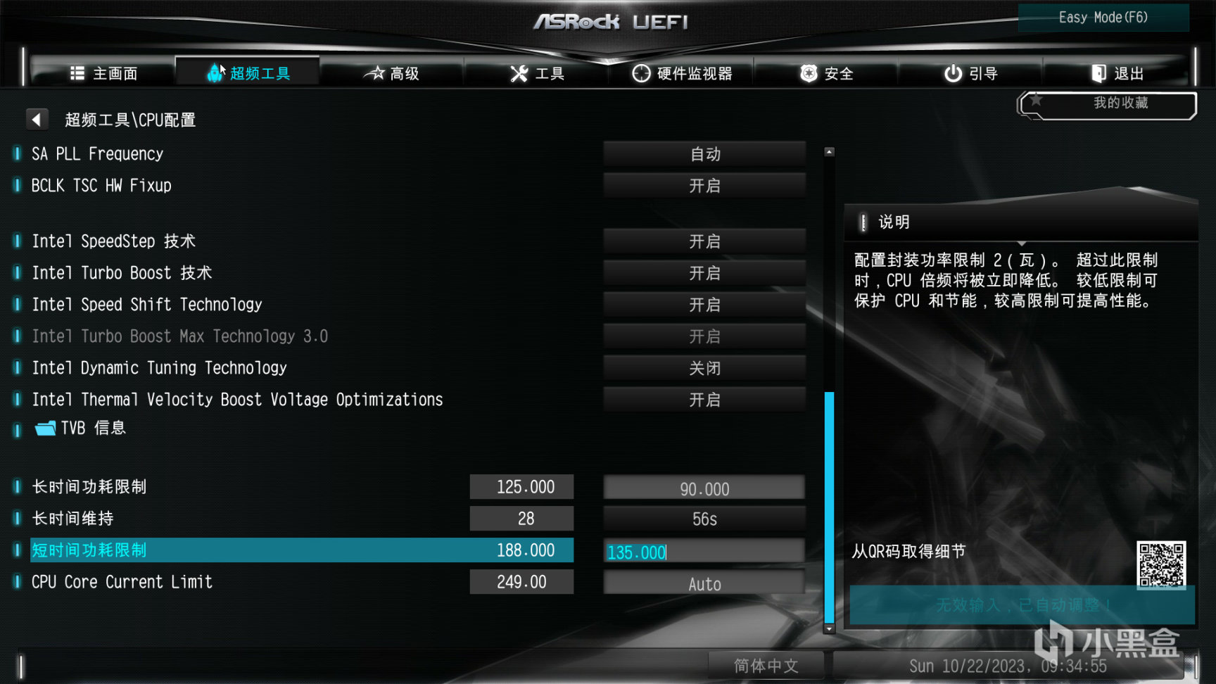 在主板超频工具CPU配置BIOS选项里,能看到上机13600K后显示:PL1功耗为125W,PL2功耗为188W,实际主板PL1和PL2功耗输入最大值分别为90W和135W,也就是理论上更适合非K酷睿i5以下级别的处理器使用。