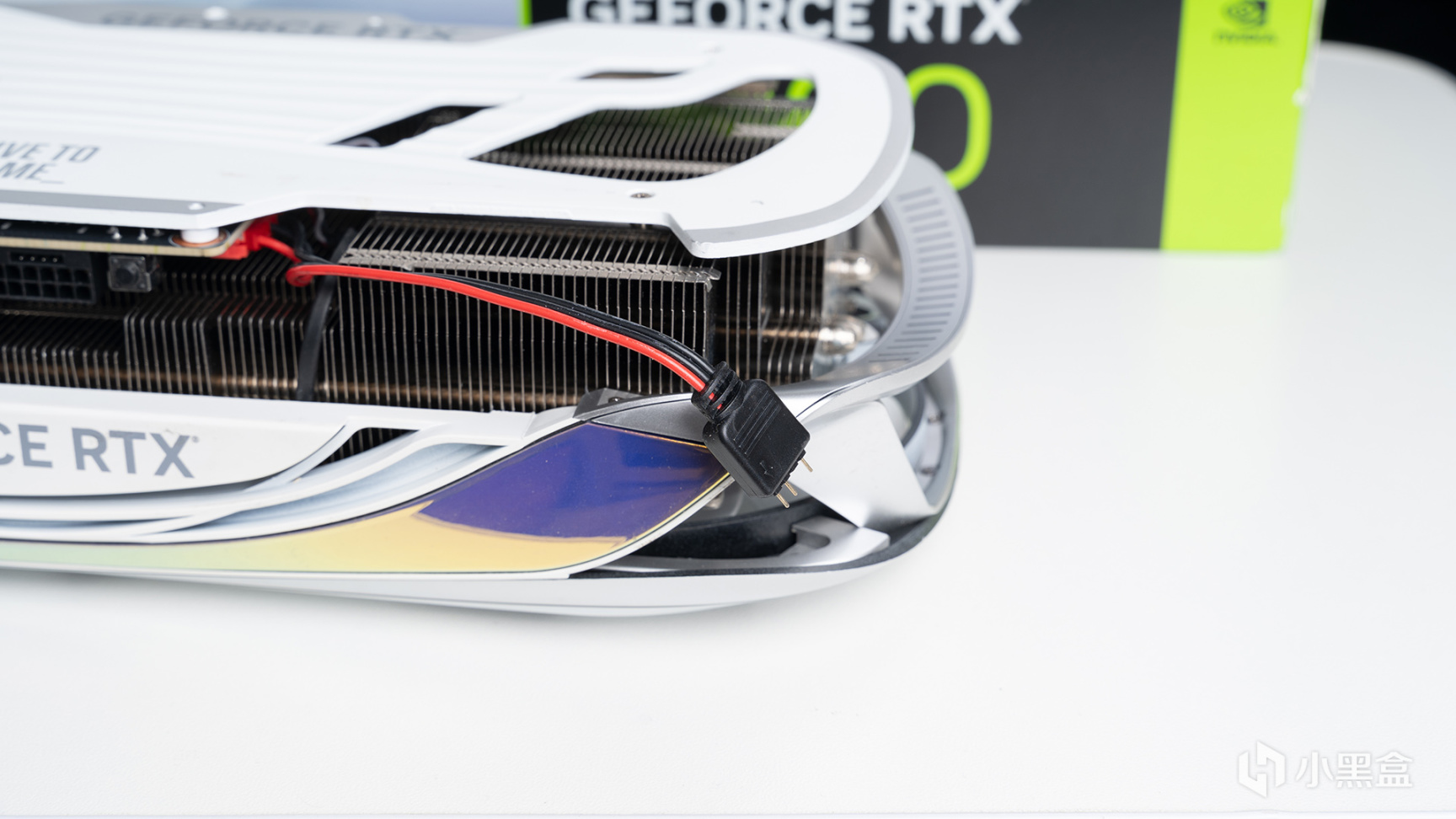 显卡肩部拥有特殊的全息SPECTRA 2.0 ARGB区域设计,这块对称的“彩虹桥”区域是采用电镀工艺打造的半透明涂层,最大的吸睛之处在于不通电状态也能展现其色彩绚丽,显卡的12VHPWR供电为用户鳍片区组偏中间的位置,而旁边黑色的按钮可以实现切换BIOS功能。