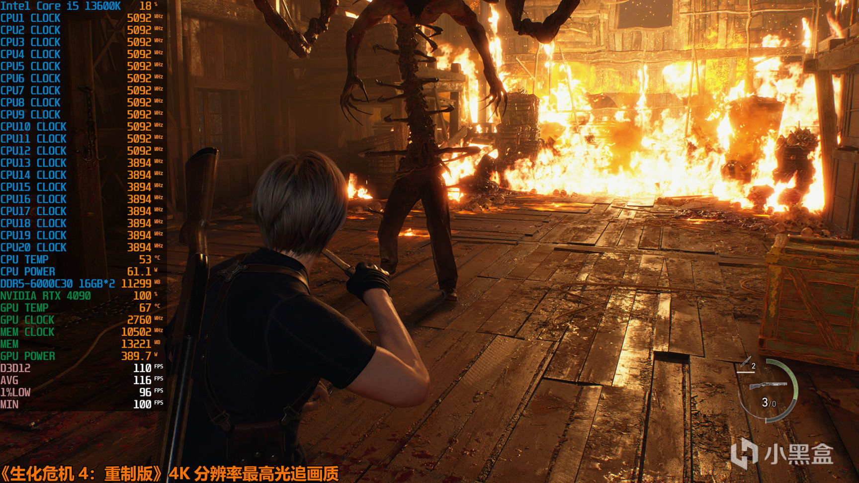 13600K+RTX 4090 AMP月白运行《生化危机4:重制版》4K分辨率最高光追画质平均帧数为116fps