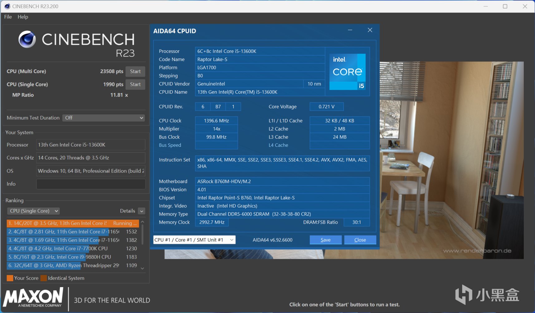 CINEBENCH R23单轮跑分,多核分数为23508 pts,单核分数为1990 pts