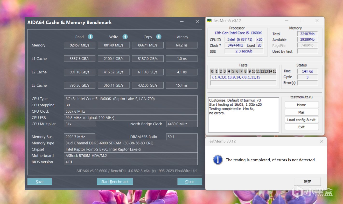 如果不想过于折腾内存超频,保留原有的内存频率,简单改变一下主时序这种方式是最快捷的,像这套DDR5-6000C32内存,只需要改变成DDR5-6000C30参数,其他电压不变,能效也有可看得见的提升——AIDA64的带宽和延迟数据都更好看了,为了确保稳定使用,还可以像硬核一样运行一下TestMem5的@1USMUS_V3配置的烤机测试,10分钟左右就能验证好。