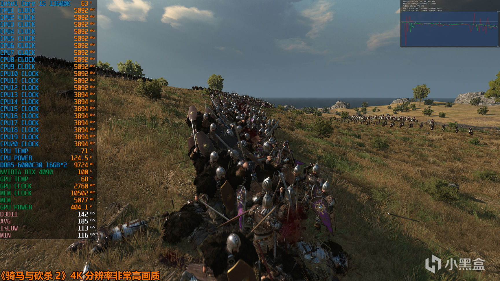 众所周知,在4K分辨率游戏中,对CPU性能会骤然降低,显然13600K搭配RTX 4090用起来和Core i9级别也是没有性能差距,各款游戏也是稳定运行在100fps以上,即便对于CPU使用率达到60%以上的《骑马与砍杀2》(这种类型的游戏较少),13600K在这款PL1功耗为90W的主板上,依然是能够顺利跑满睿频的。