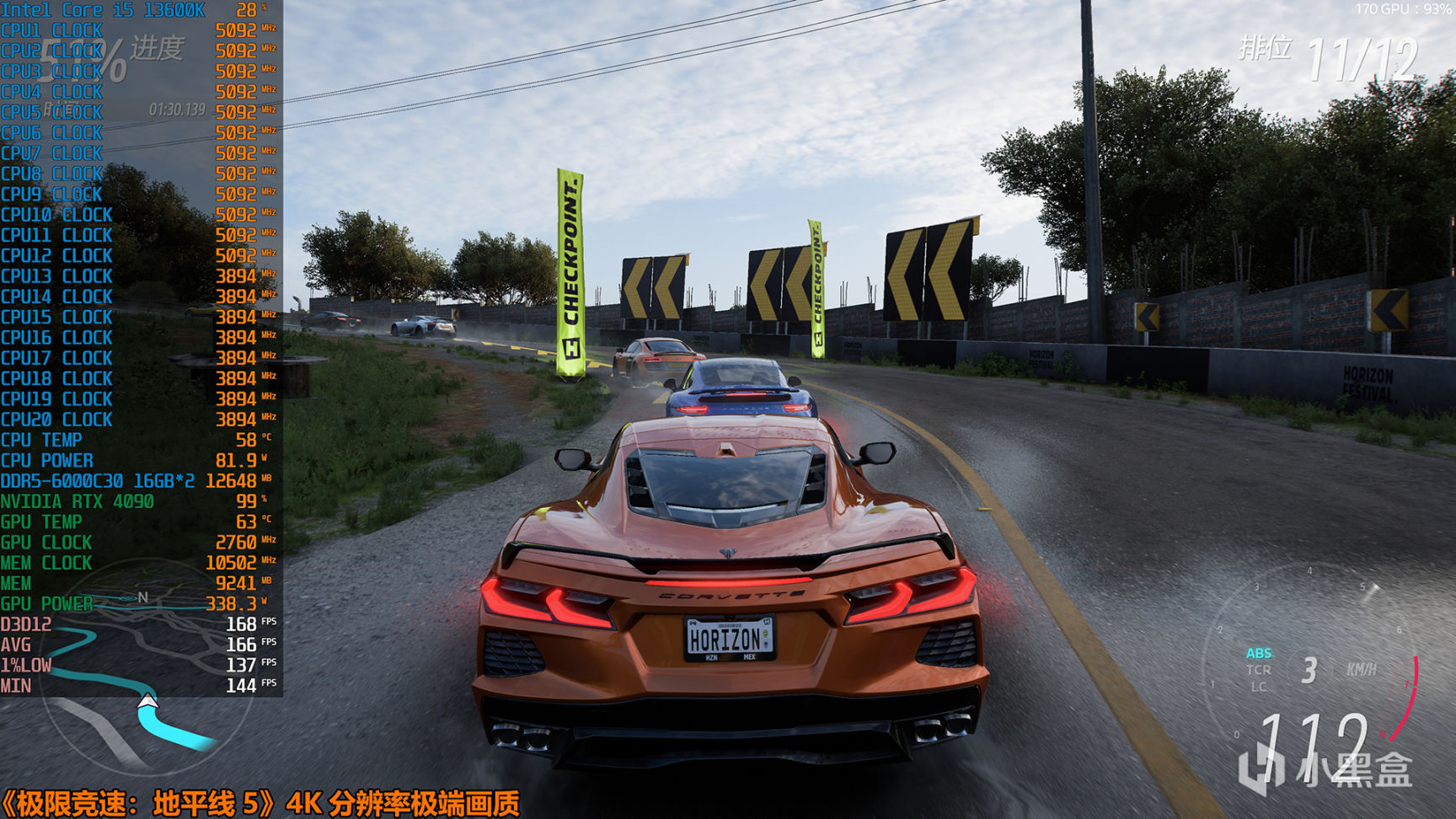 13600K+RTX 4090 AMP月白运行《极限竞速:地平线5》4K分辨率极端画质平均帧数为166fps