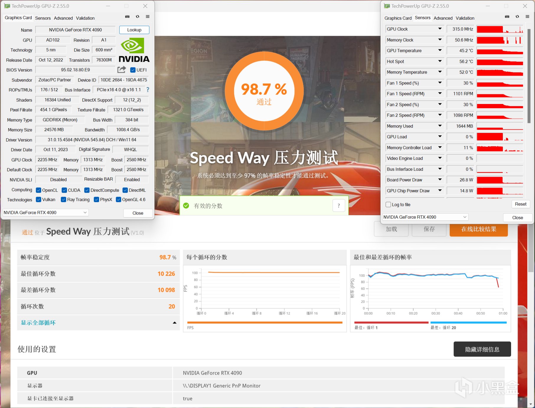 RTX 4090 AMP月白通过Speed Way压力(光栅化和光追结合的项目)测试的稳定度是98.7%,在封箱状态下最高温度只有71℃,最高GPU频率可达到2760Mhz,而CPU温度只有62℃,浮动在50W左右,GPU功耗长时间浮动在400W以上,能有这样的温度表现算是不错了。