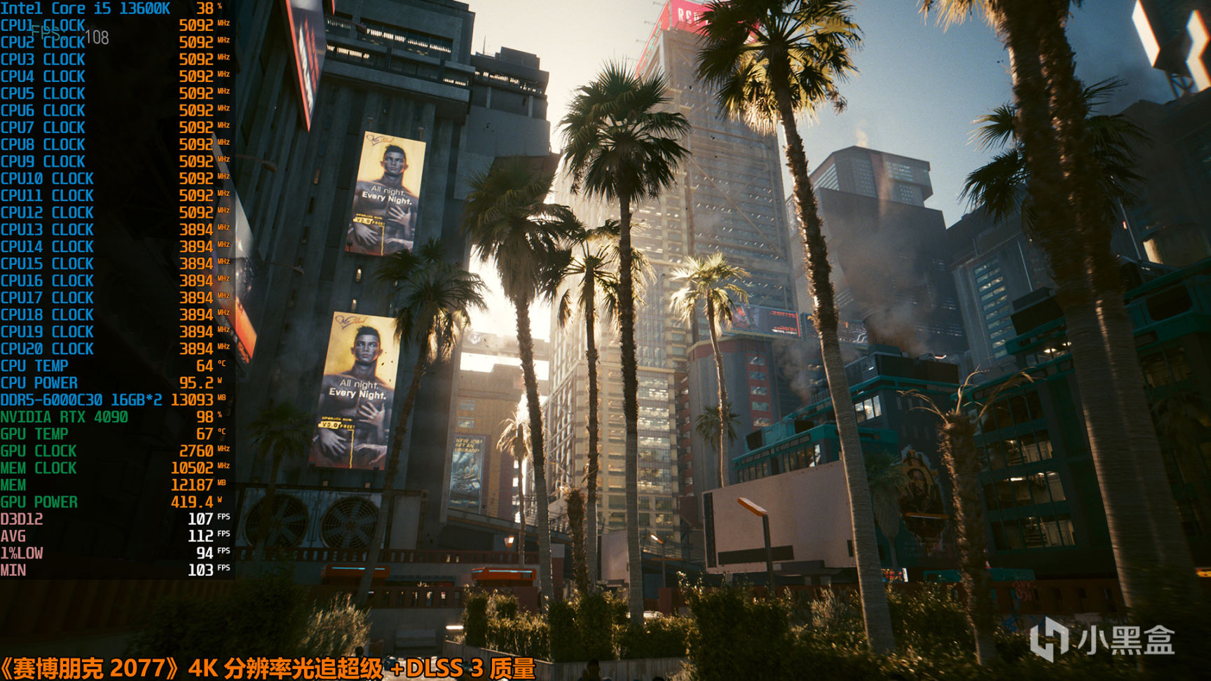 13600K+RTX 4090 AMP月白运行《赛博朋克2077》4K分辨率光追超级+DLSS 3质量平均帧数为112fps
