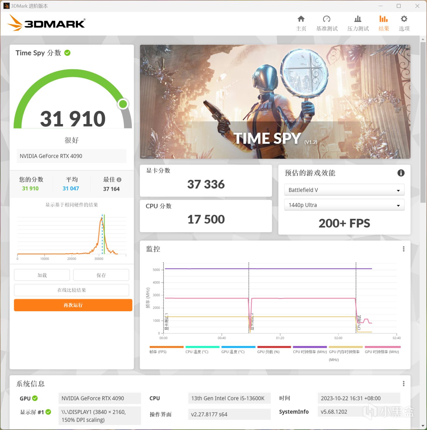13600K+RTX 4090 AMP月白,3DMark Time Spy显卡分数为37336,CPU分数为17500
