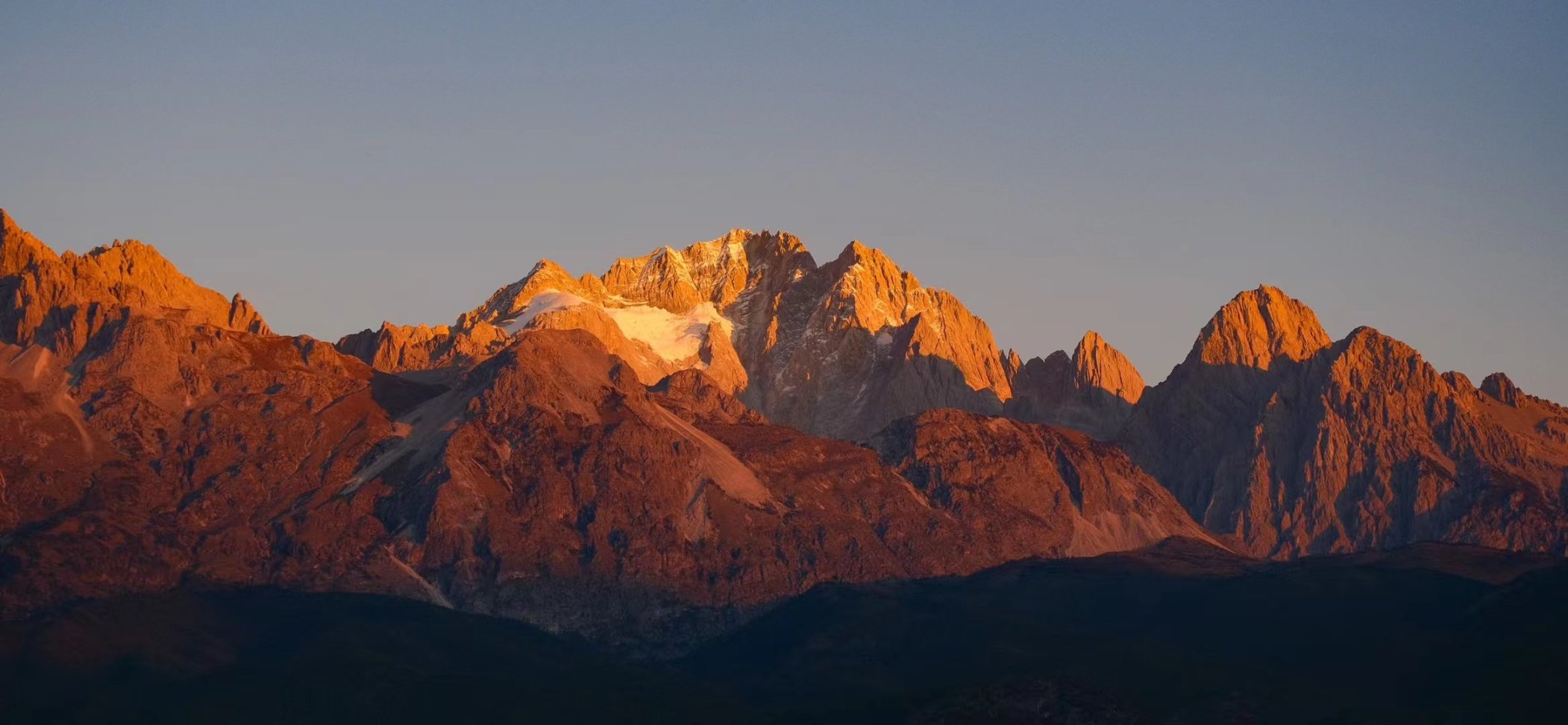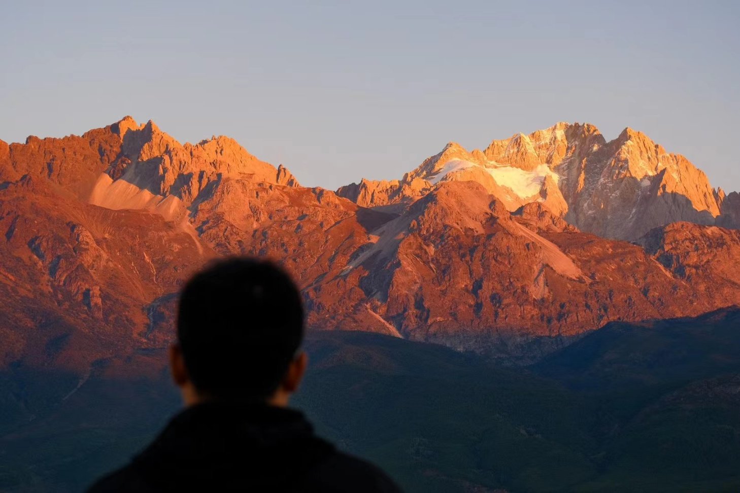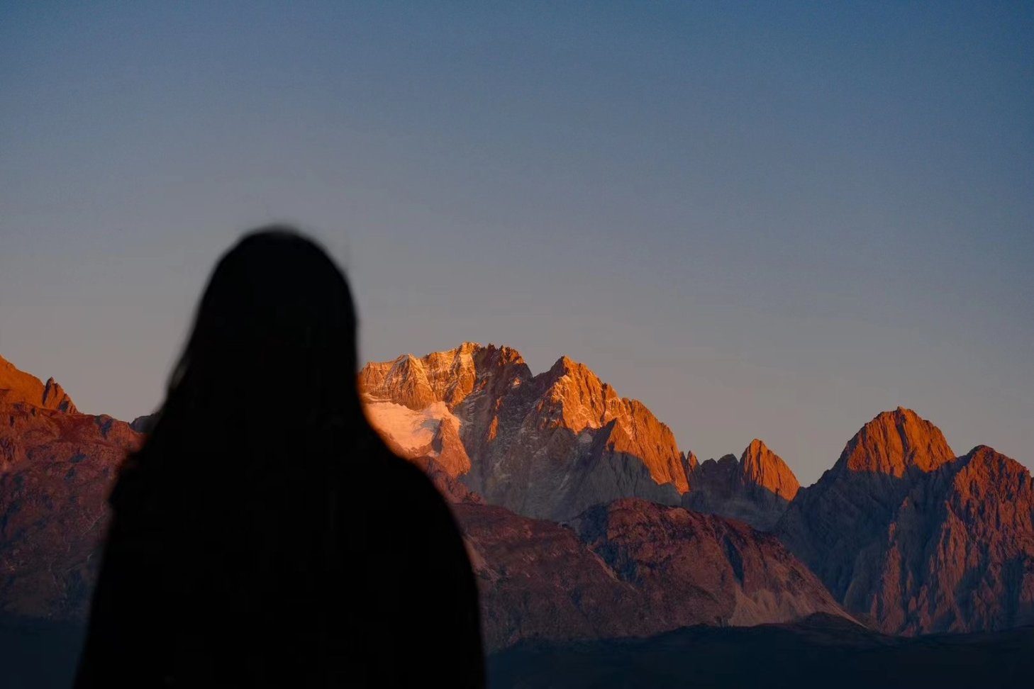 我們定了一個犛牛坪中索道一日遊一個人兩百多(上雪山的大索道在檢修,現在已經檢修結束了),早上六點多司機師傅就在古城接我們了,本來一車有七個人,其中一隊夫妻有事不來了,我們就變成了五人的精緻小團,去的路上看到了日照金山,雖然不是最好的機位,但是也很滿意了。
