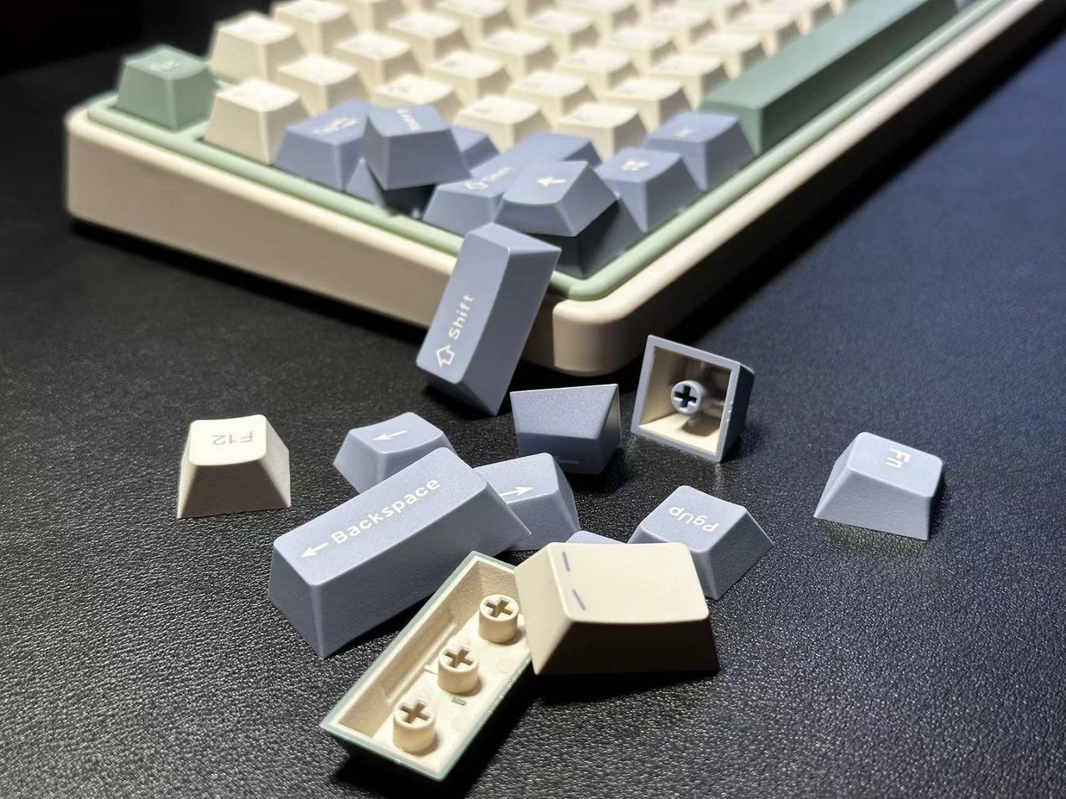 迷你洛75键帽采用二色ABS,高度为原厂高度。键盘整体的做工是属于T1级别了,水口处理以及上色都是非常ok的,整体的手感偏细腻。键帽虽然添加了一定的磨砂颗粒来延长寿命,但是ABS还是没PBT寿命高。