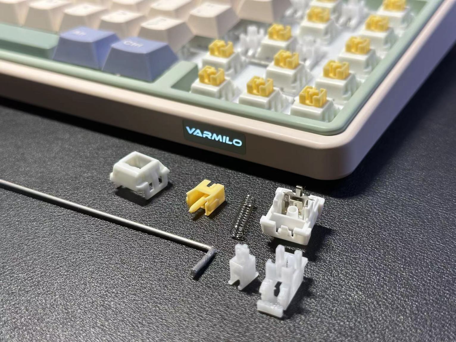 迷你洛75在轴体选择上有静电容和机械轴来选择,但是静电容是双模所以我选着的机械轴版本。我手上这个为阿米洛自研的雏菊黄L轴。雏菊黄L轴的上盖采用POK材质,轴芯采用POM材质,弹簧为18mm,底壳为尼龙材质。轴体是做了出厂润滑处理的,整体声音放在现在来说不是那么HIFI,但是轴体的顺滑程度是非常NB的存在,是一个不错的轴体。