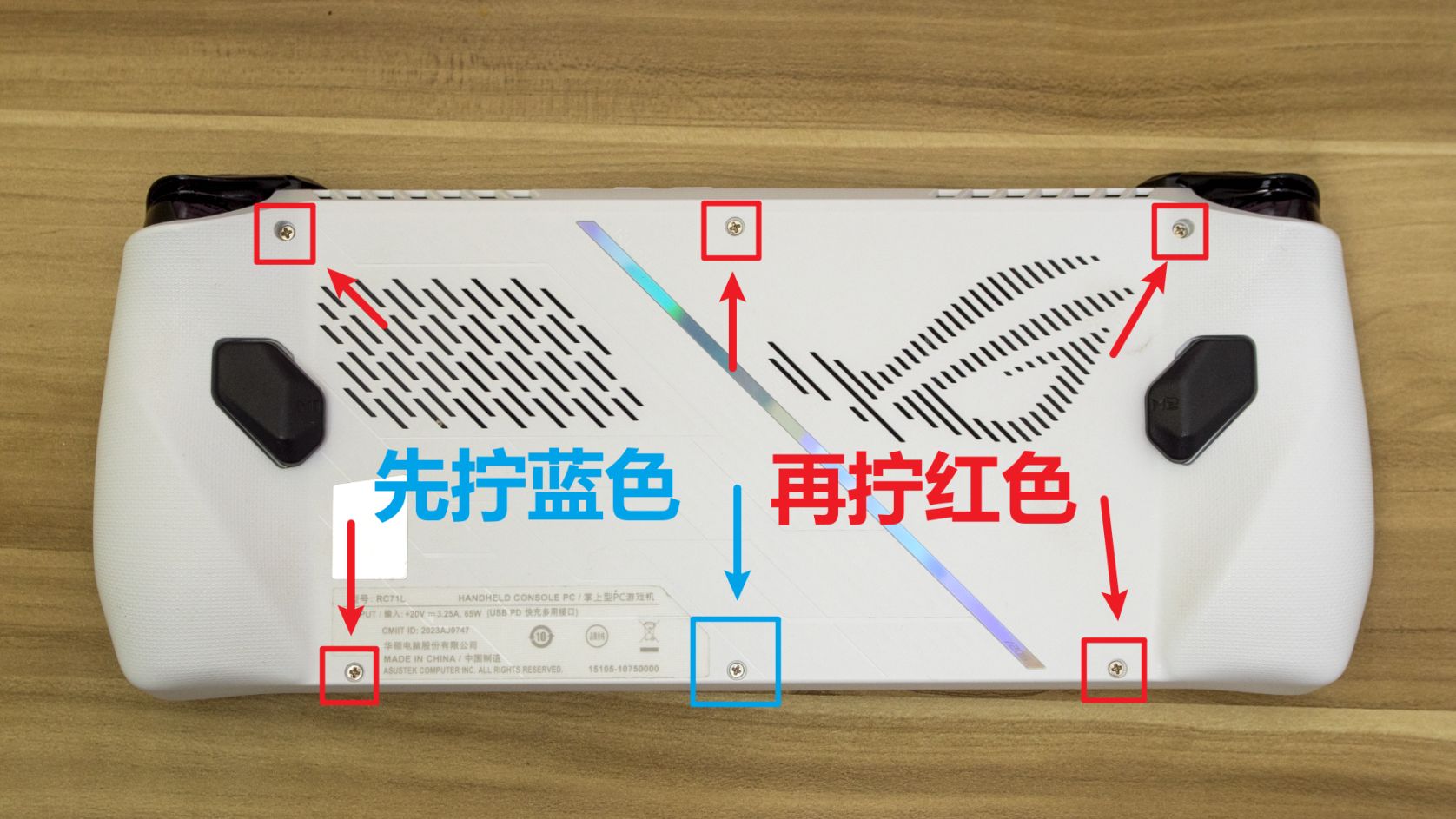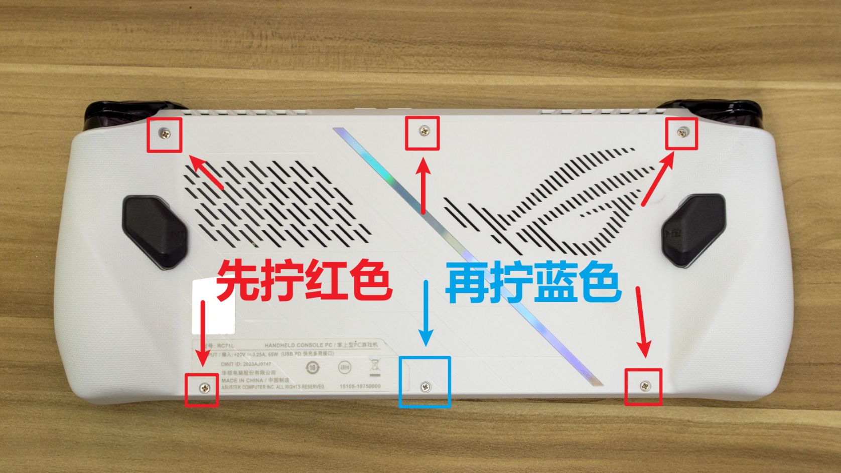 ROG掌机背面一共6颗螺丝,5颗可拆卸螺丝(红色箭头),1颗固定螺丝(蓝色箭头),螺丝规格都是PH00。在拧螺丝的时候,先拧周围五颗可拆卸螺丝,最后再拧中间下面的那颗蓝色标识的固定螺丝。