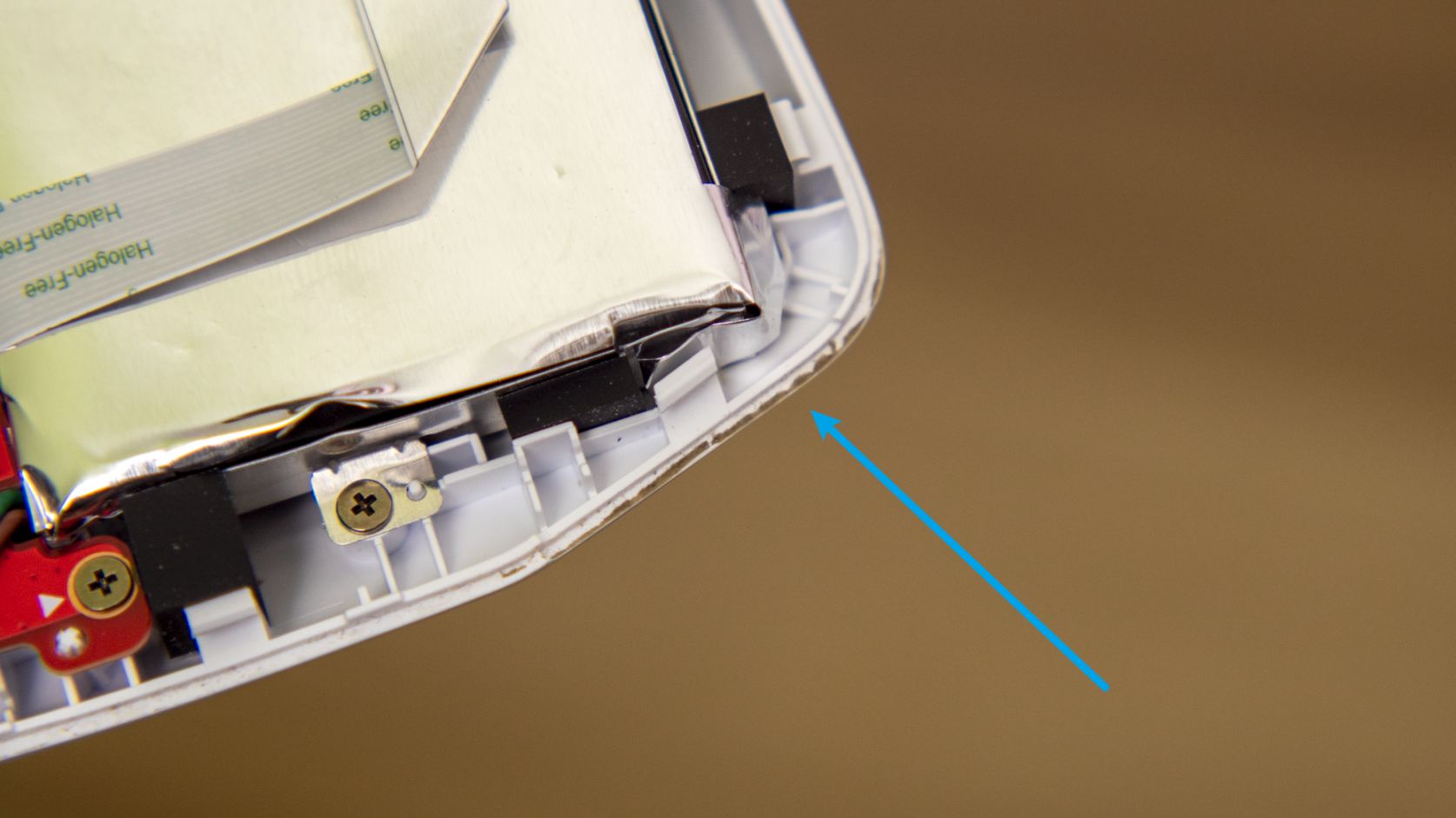 拧松最下边的这颗固定螺丝后,边框会被这颗螺丝顶起一个缝隙。用身份证或者银行卡,插进去沿着缝隙绕着掌机划一圈,机器就开了。