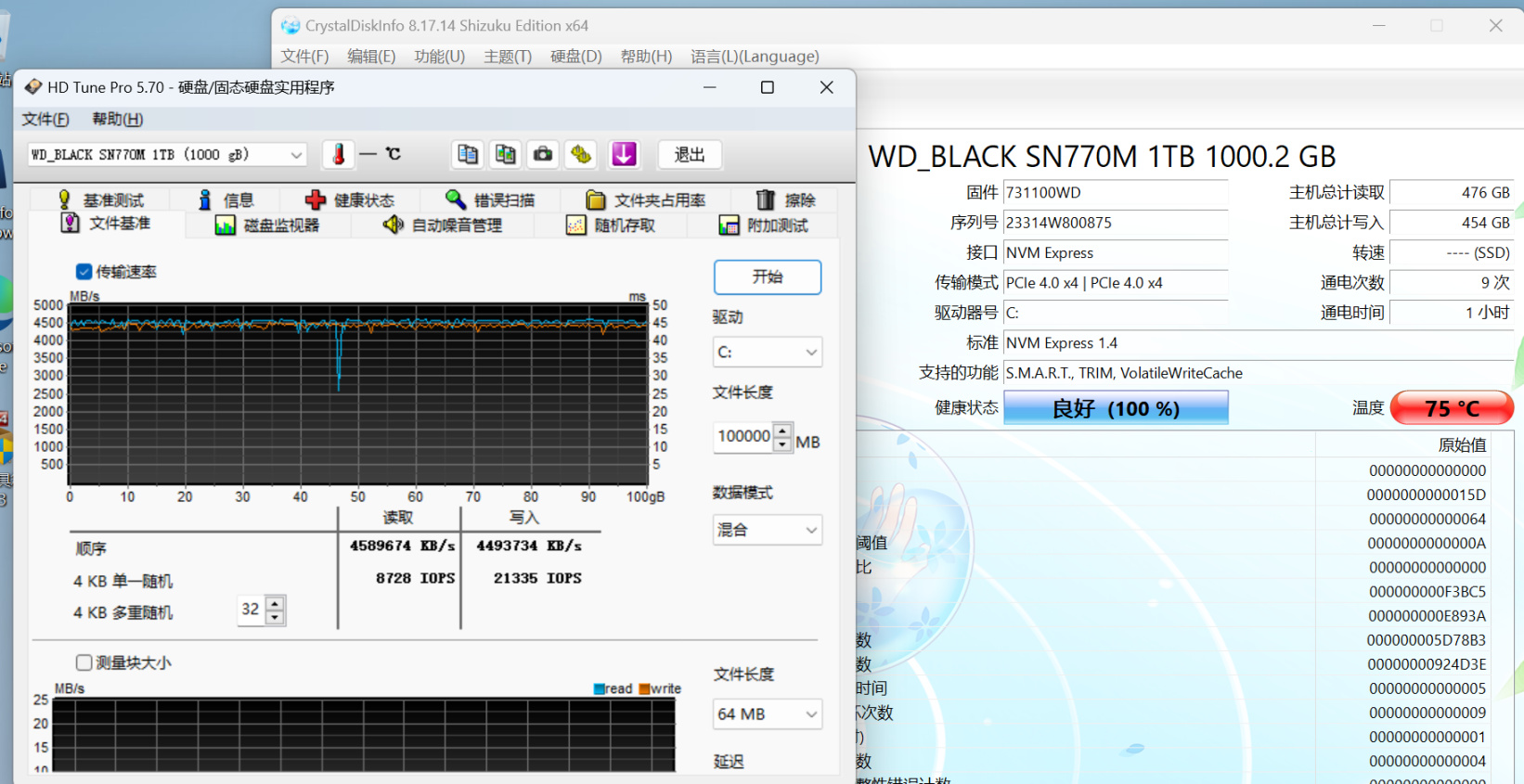 连续跑100G的高压混合读写,此时CDI检测到的硬盘温度是75度,和原装的SN740不相上下。高性能盘在这么狭小的空间里的散热条件属实有点遭罪,有条件的建议加个散热片使用。