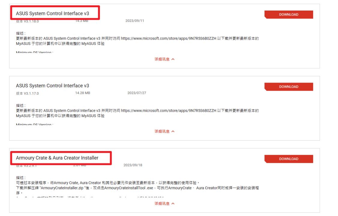 ASUS System Control Interface v3和Armoury Crate & Aura Creator Installer。