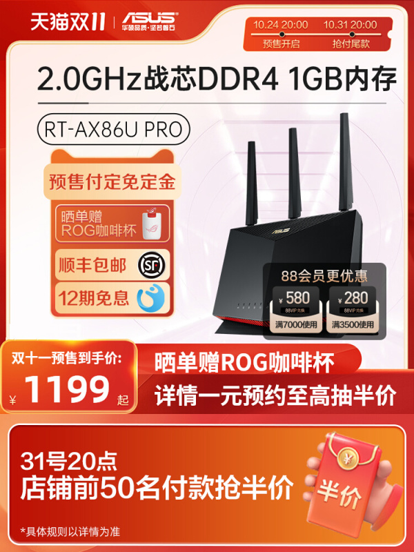 華碩RT-AX86U Pro是一款升級版的路由器,搭載了博通2.0GHz四核PC級處理器,擁有更強大的算力表現。配備了256MB閃存和1GB DDR4內存,顯著提高了性能和響應速度。相比於華碩RT-AX86U,RT-AX86U Pro的算力提升了11%,可以更快地完成各種任務。此外,它還具有2.5G自適應端口,支持雙WAN、雙LAN鏈路聚合等多種連接方式,爲用戶帶來更加便利的使用體驗。與其他在售的華碩機型輕鬆組網暢聯,是一個值得推薦的選擇。雖然價格稍高,但一步到位購買RT-AX86U Pro可以獲得更好的性能和更高的效率。雙十一定金100,最終到手1199元