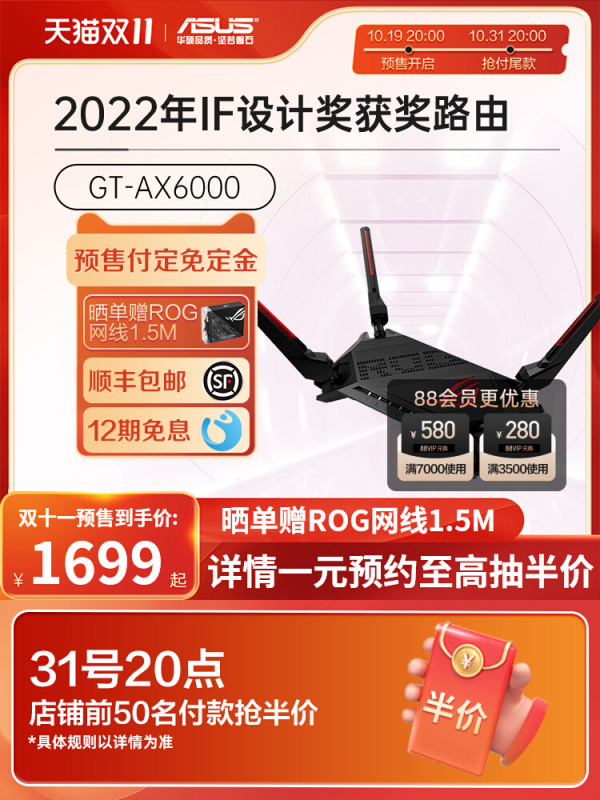 華碩天選無線路由器TX-AX6000是一款遊戲路由,採用聯發科2.0Ghz四核MT7986A處理器,1148 Mbps 2.4GHz+ 4804 Mbps 5GHz的經典組合,6000 Mbps的無線帶寬配合雙2.5G網口,跑滿2000M網絡不是夢,獨立的電競LAN口加上內置三重遊戲加速功能,無論是PC、主機還是電競手遊,均可輕鬆獲得絲滑遊戲體驗,這次雙十一價格上也到了非常划算的價位。