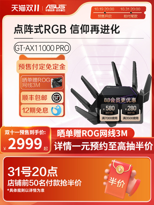 ROG GT-AX11000 Pro路由器採用了八根粗壯的外露天線,有效提高信號接收和發送強度,提供更穩定、快速的連接,無論是網絡遊戲還是在線視頻。正面點陣式RGB“敗家之眼”LOGO燈,支持七種電競燈效和Aura RGB神光同步功能,爲你的遊戲裝備增添個性化時尚元素。該路由器擁有出色的硬件配置,包括滿血萬兆(10Gbps)網口、四核2.0GHz博通處理器、1GB內存以及256MB閃存,確保在各種應用程序高速運行時保持流暢高效的性能表現。ROG GT-AX11000 Pro路由器搭載兩個5G頻段和2.4G頻段,無線總速率可達11000Mbps,讓你無論是進行在線遊戲、視頻觀看還是其他多媒體應用,都能享受飛快的網絡速度和出色的穩定性能。同時,支持U-NII4提供更廣泛的無線覆蓋範圍。這次雙十一價格一樣的優惠。