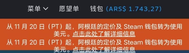 從 11 月 20 日(PT)起,阿根廷和土耳其將開始新的美元定價The Steam store in Argentina and Turkey will start using USD, along with new regional prices for LATAM and Middle East/North Africa for 25 additional countries/ territories.