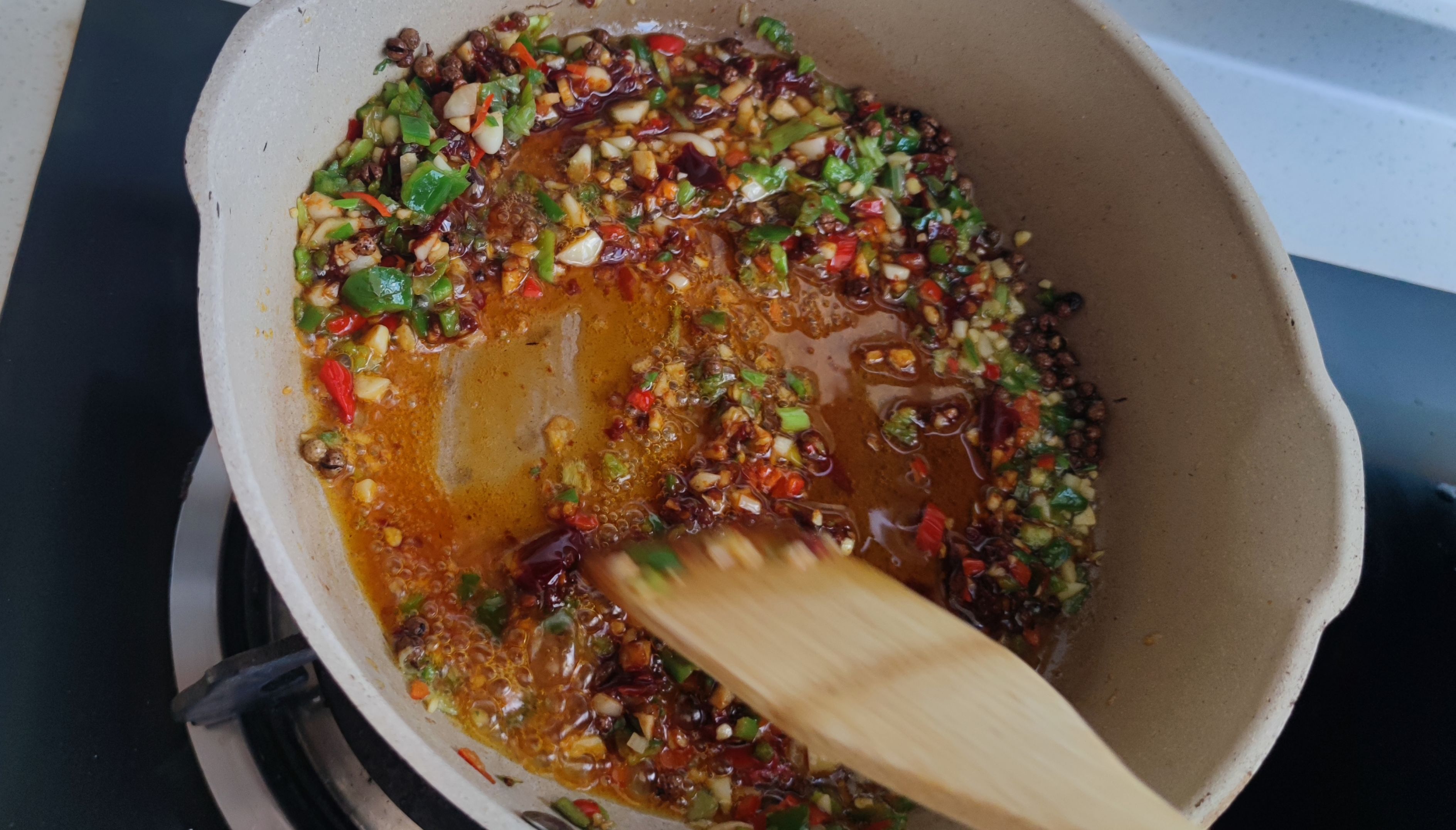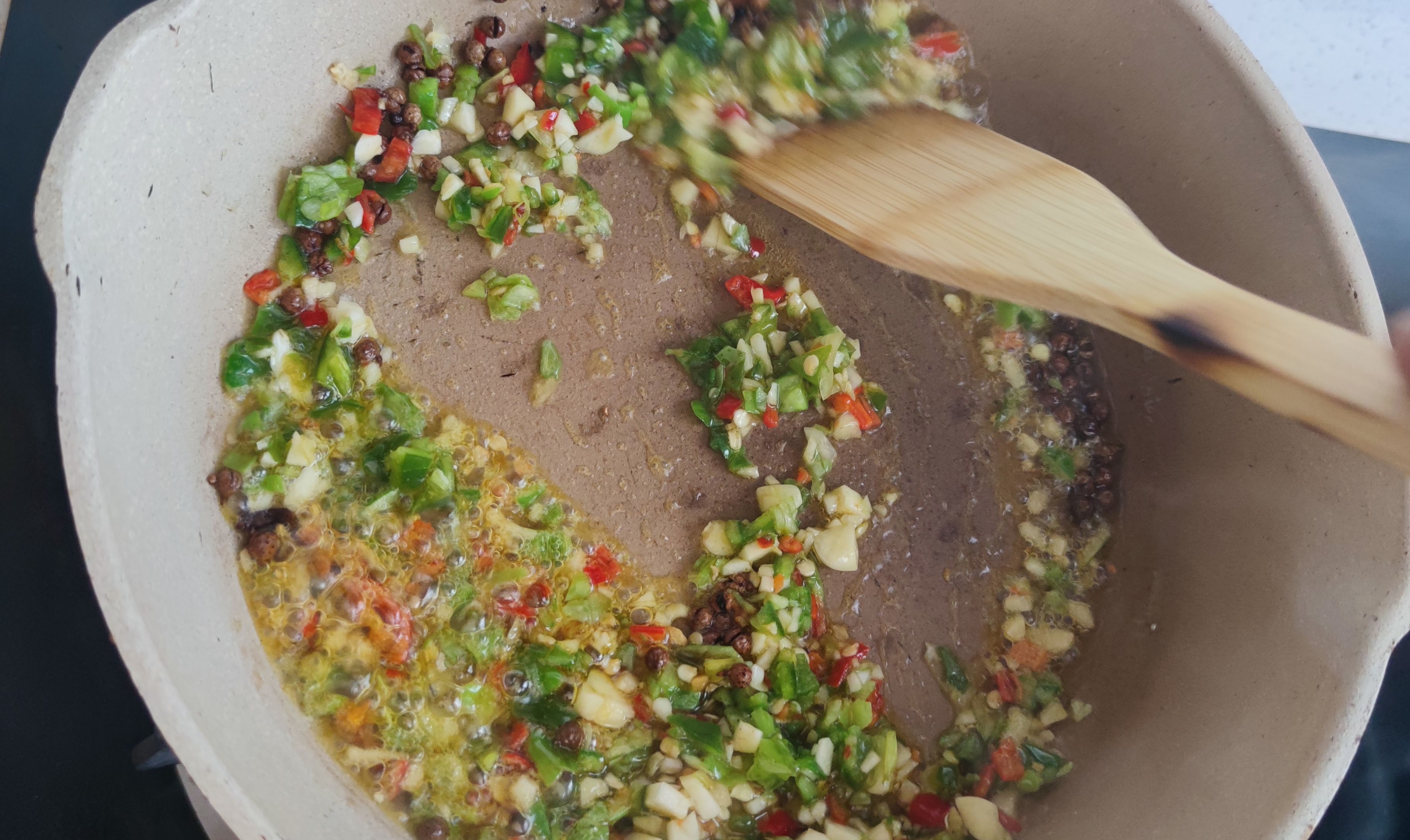 第三步:鍋中加蔥蒜小米辣,青椒末,翻炒一下