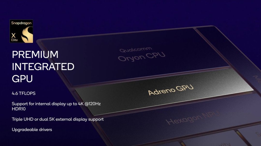 高通的Oryon CPU基於4nm工藝製造,採用64位架構,擁有最高3.8GHz的12核,單核和雙核的最高頻率可達4.3GHz。附帶的Adreno GPU性能卓越,可處理高達4.6 TFLOPs的計算任務。