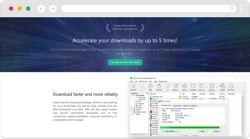 Internet Download Manager 是一款备受好评、无广告、不限速的下载工具。自动捕获链接, 网页视频下载等功能为探索者提供纯粹的资源下载体验,推荐体验。