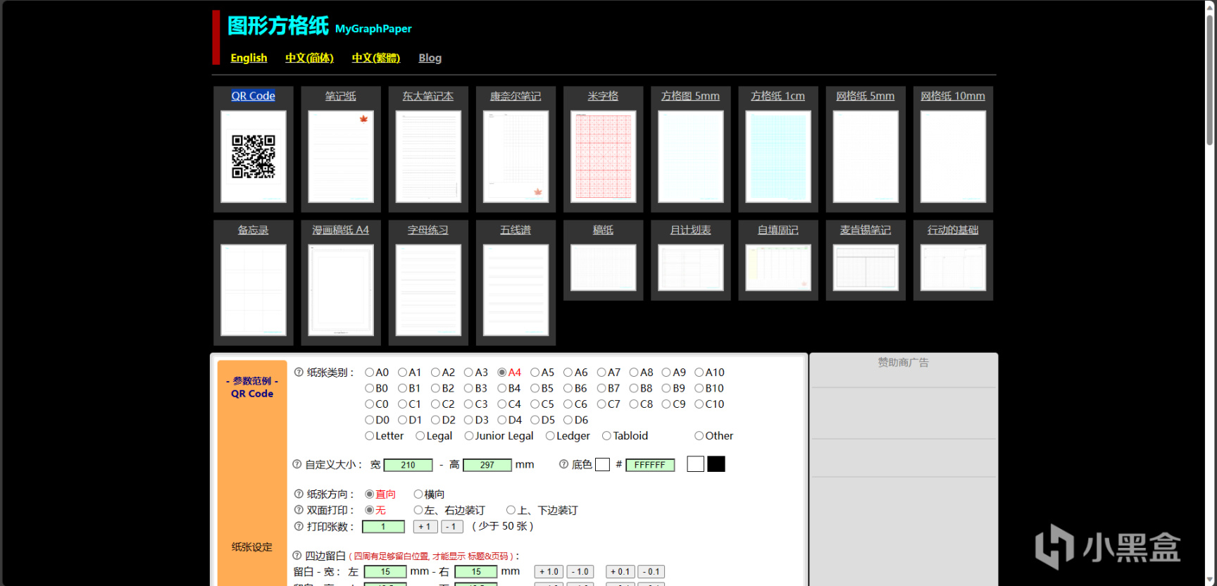 網站提供了17圖像筆記格式和一個OR碼,可選擇紙張的類型、自定義大小等等