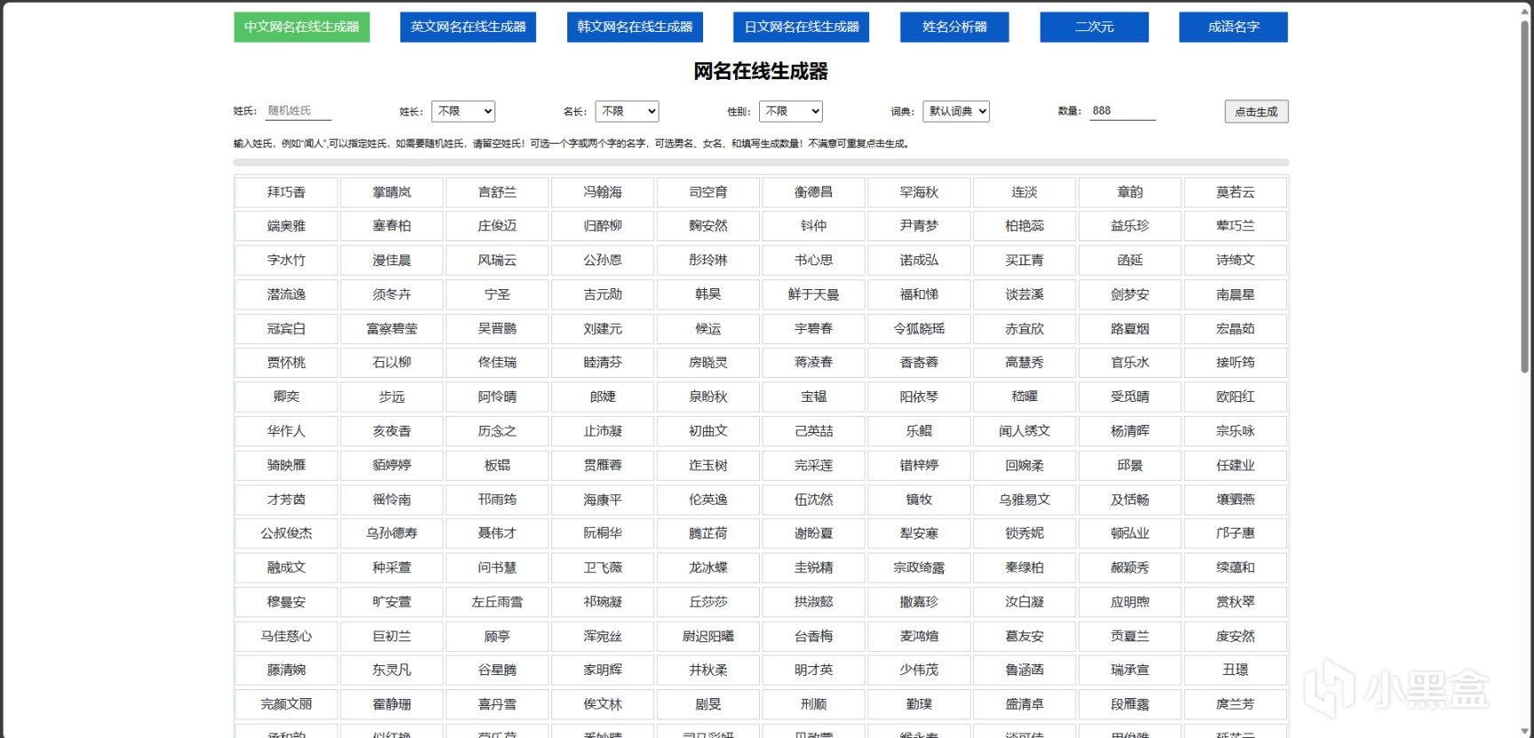 這個網站可以在線生成中文、韓文、日文、英文等姓名,這些姓名不一定用得上,因爲有些還挺沙雕的,但至少會給你起名字帶來靈感