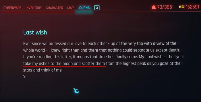 位置也很好找,玩家可以從主路繞道而行,往下走數層樓梯,進入一個佈滿盒子的小房間。其中一個盒子旁邊有一則可讀數據,上面寫着“最後願望”,這就是《巫師3》中的同名支線任務。在這個任務中,傑洛特和葉奈法在雪山頂上共同解除了迪精的詛咒,並最終坦誠彼此的心意。