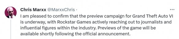 5.爆料者Chris Marxx在9月26日確認《GTA6》將於2023年10月26日正式官宣。Chris Marxx 稱《GTA6》的媒體前瞻活動正在進行中,R星正在積極的與遊戲業內有影響力的人物和記者們接觸,在R星正式官宣《GTA6》不久後,媒體前瞻視頻/文章也將解禁。