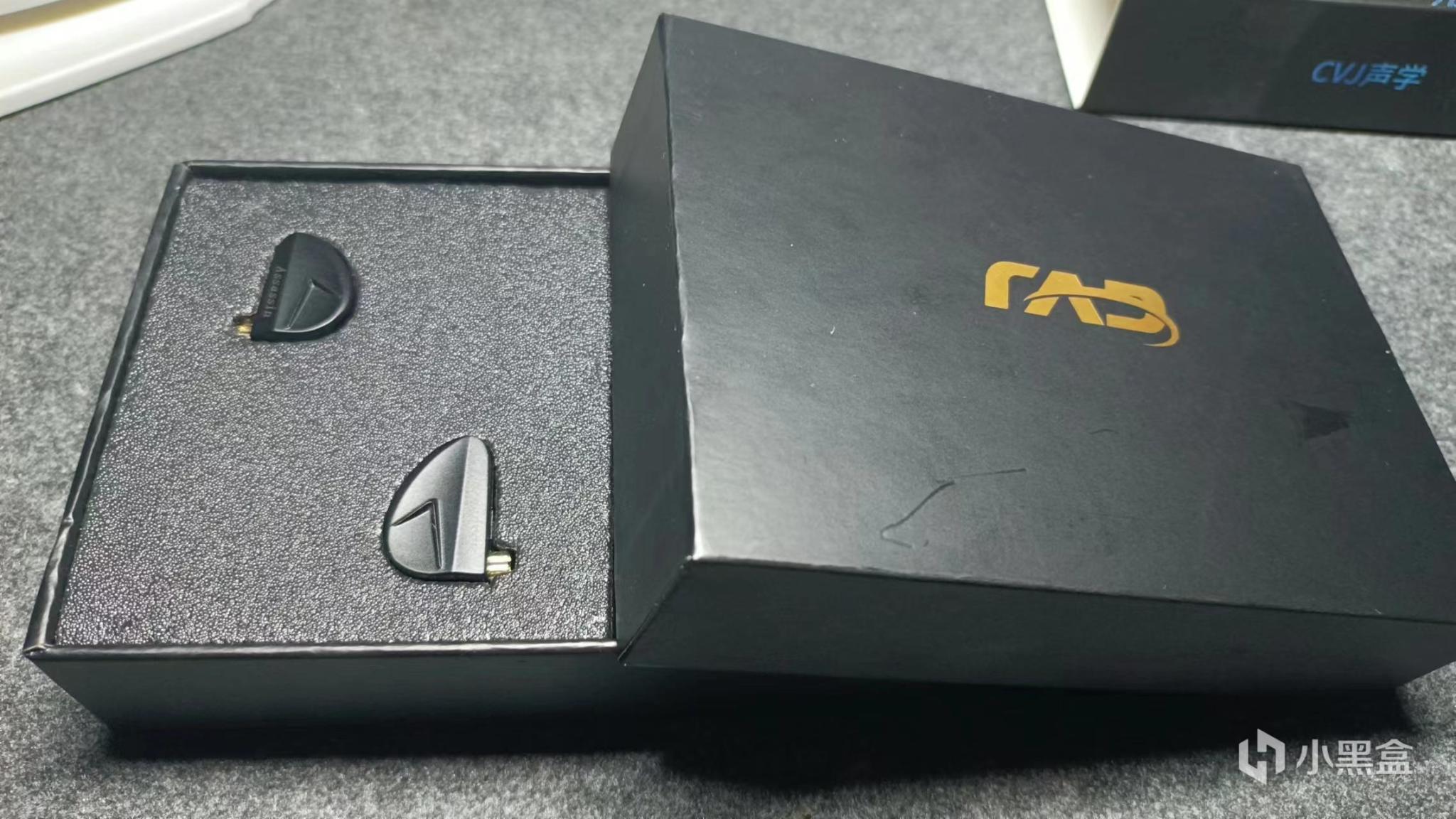 拉开外包装后就是一个天地盖形式的小礼盒,礼盒封面上CVJ logo是烫金文字,背景则是神秘黑色。这个“外套”还是封闭性和安全性很强的,里面耳机被厚厚的海绵包裹住,避免运输过程中的移位。礼盒大小刚好套住内胆,没有一丝多余的缝隙,导致包装很紧。