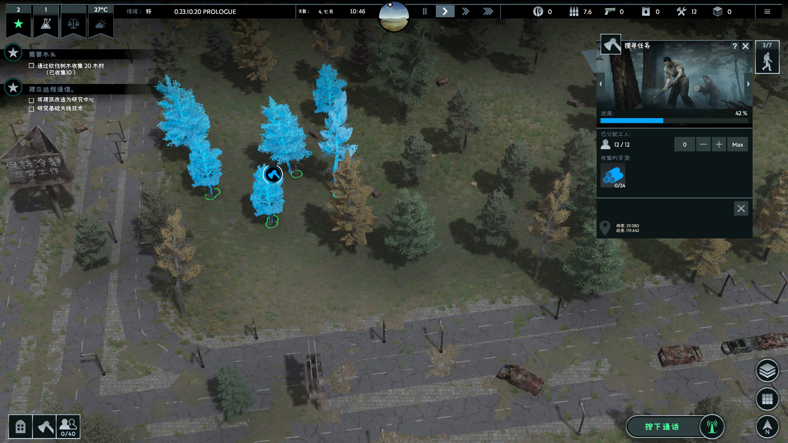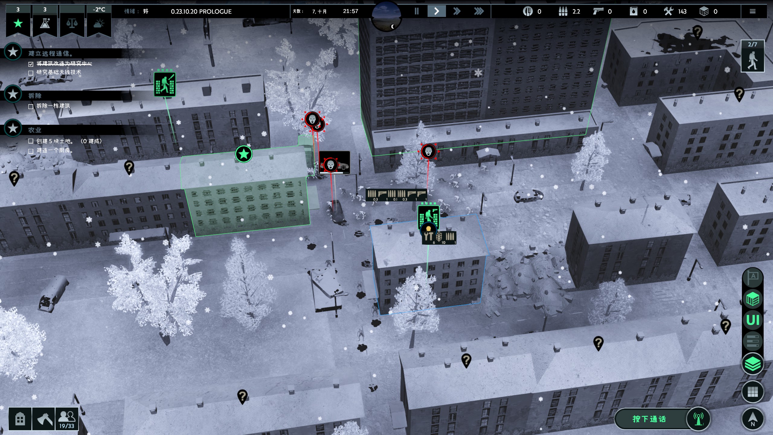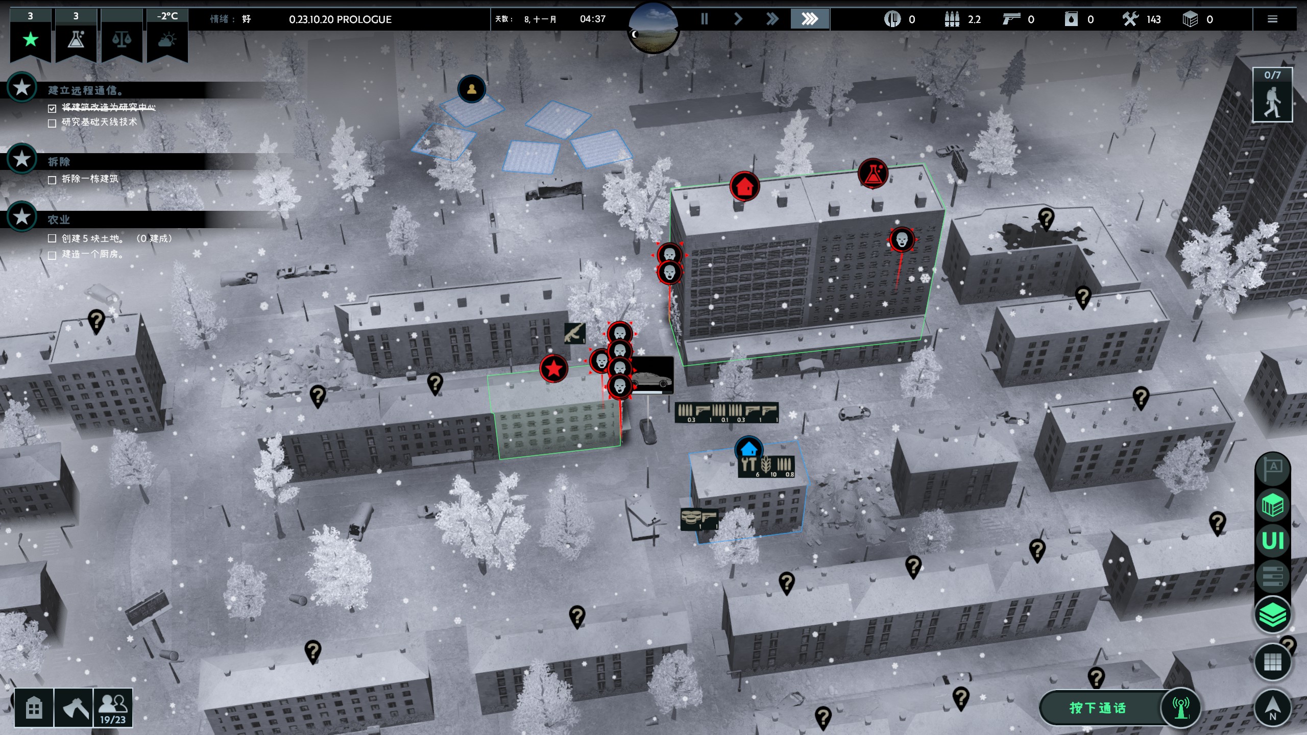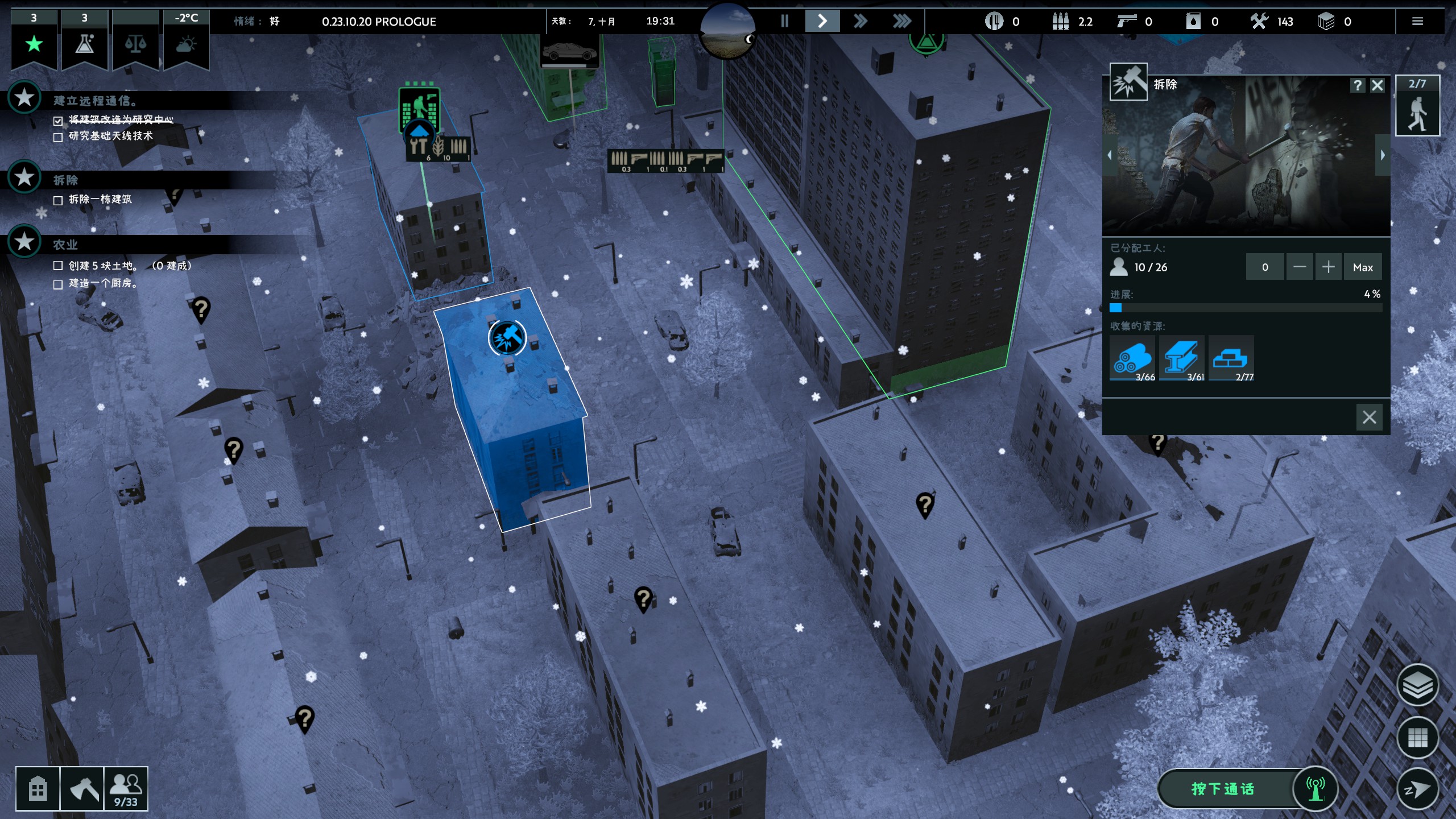 白天——安排小队出去搜刮物资,指派平民去施工,以及伐木、拆迁、种田,以便资源运作。