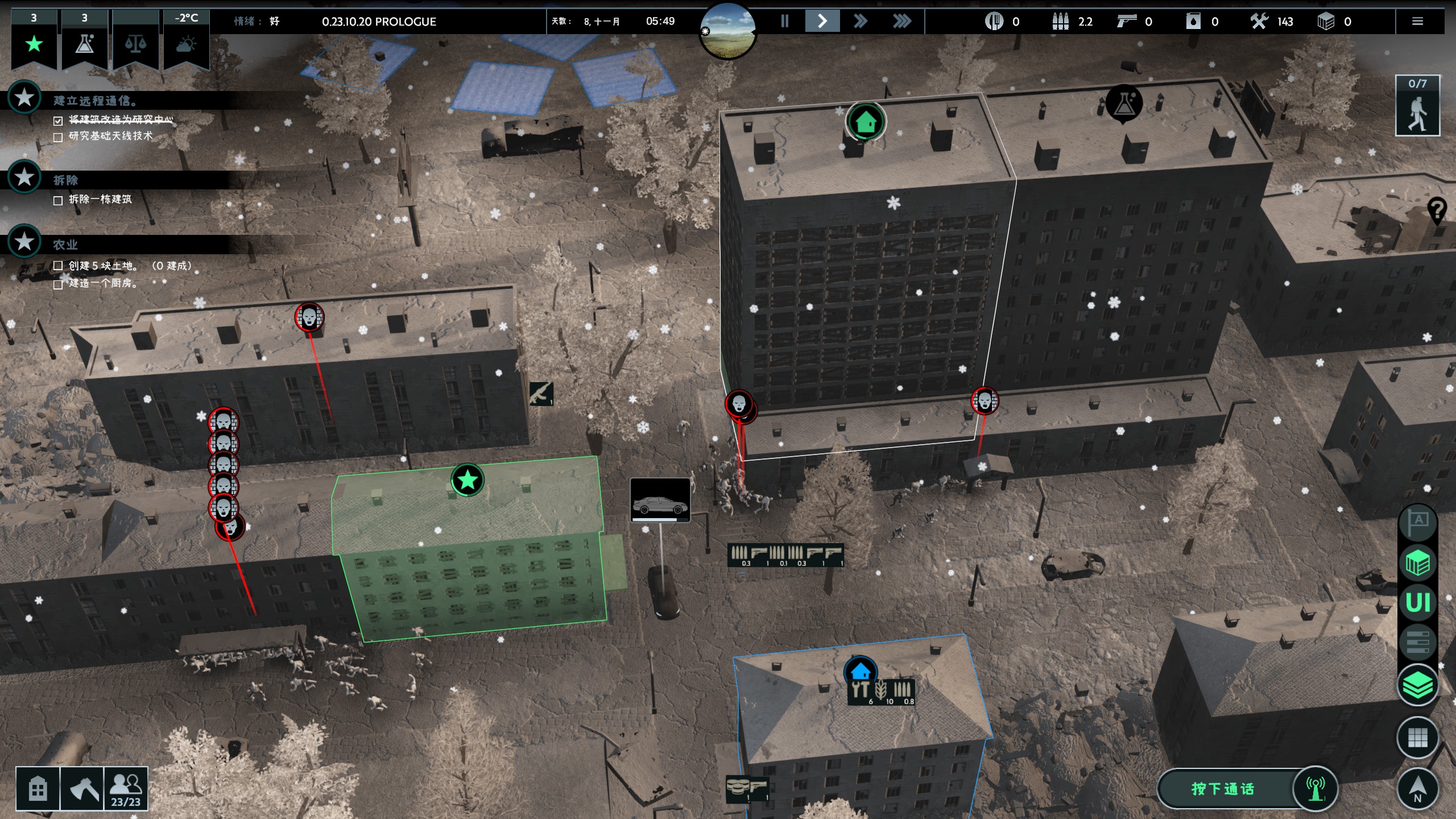 小队在搜刮完毕并确保了安全之后,玩家就可以对这座建筑物进行相应的改建,例如可以收纳幸存者的避难所、建造研究中心来研究更多生活设施与武器、增强无线电信号的天线、包括避难所内的医疗中心、而序章还未解锁的居民楼、食物厂、锯木厂、工具厂等等物资上的再生资源设施都可以在正式版中完整的体验到,这些都是你重建人类家园所要必备的生活设施。