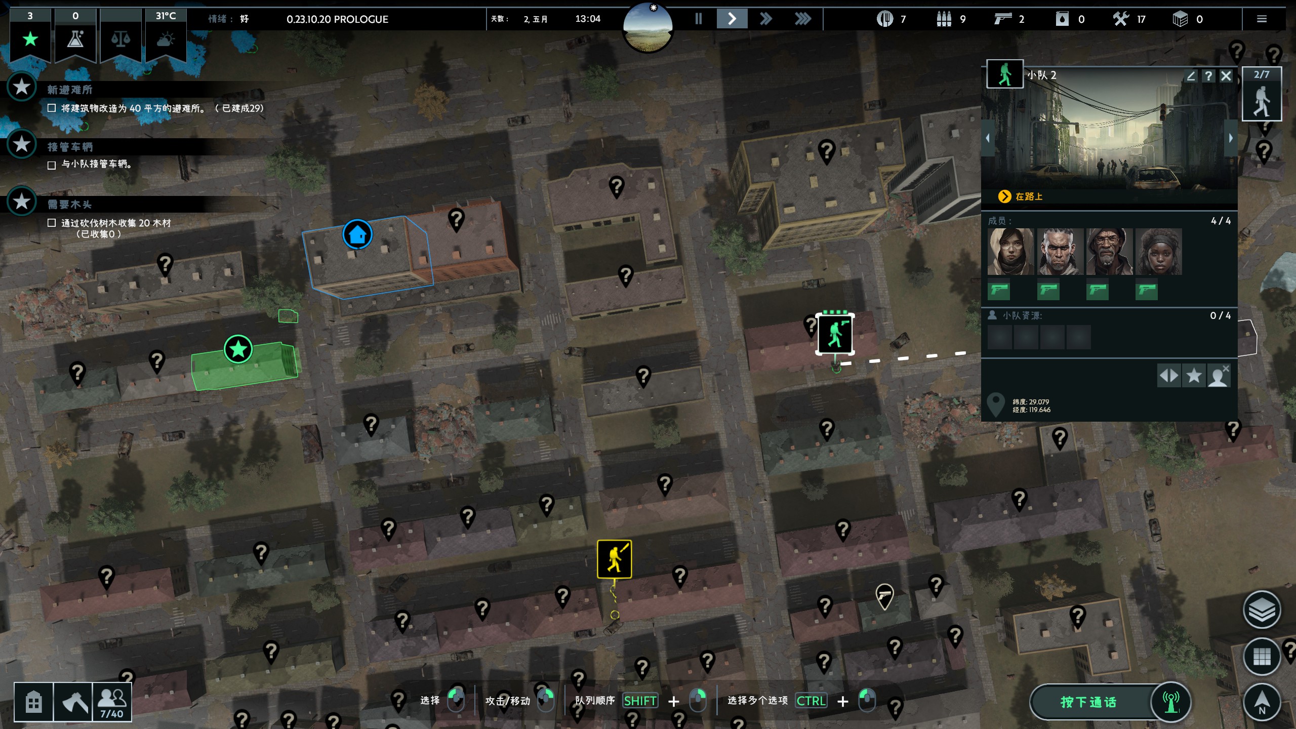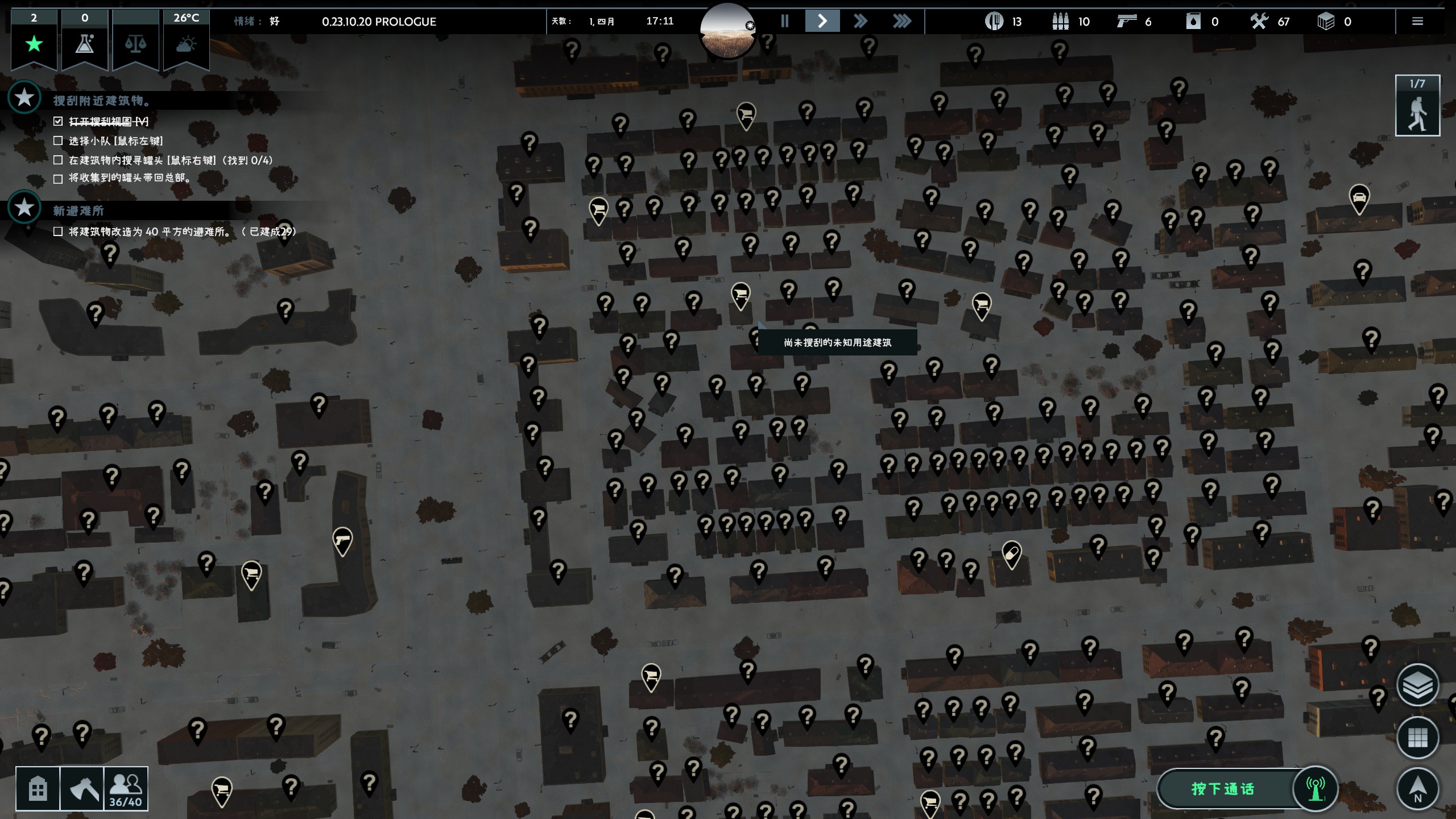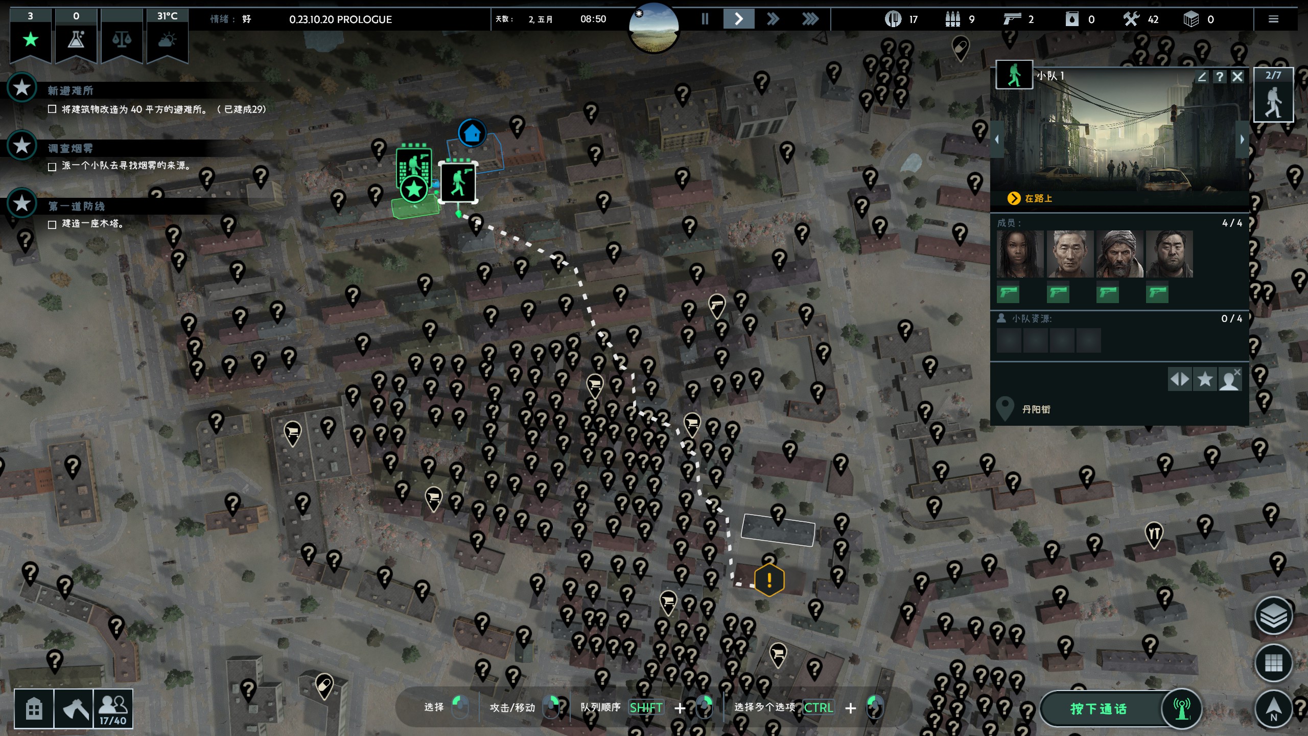 创建你的第一支武装小队后,便可以派出小队去地图上任意一座建筑物进行物资搜寻并进行清场。因为丧尸全部在白天躲在建筑物里,所以每一座建筑物都很有可能就是丧尸窝,若运气好的话你也会搜到一座完全空荡的居民楼。