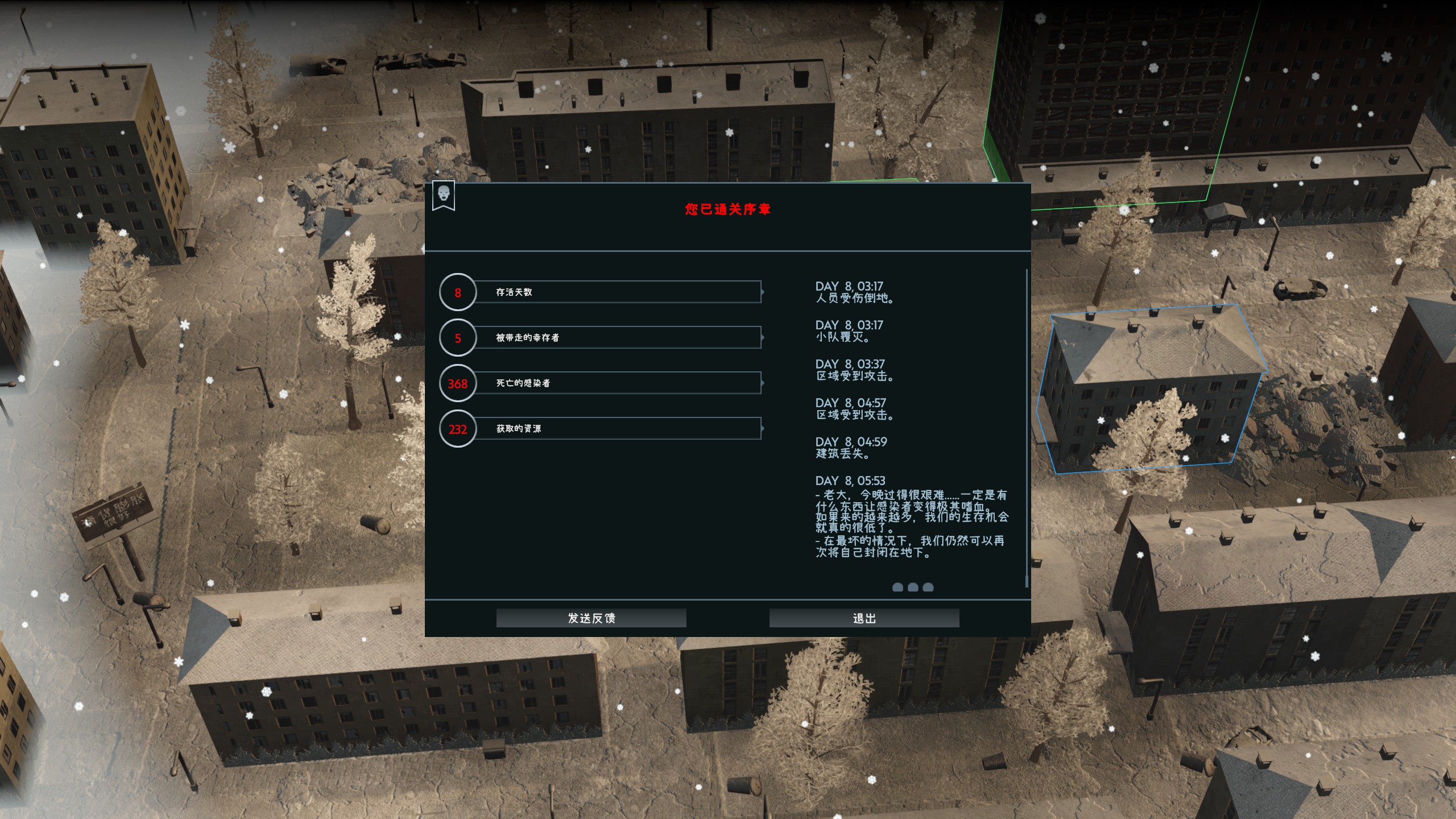 在最后的第八天,由于我前期没有做好防御措施,导致总部隔壁的居民楼已被丧尸杀了个精光。当所有的人口都被丧尸杀光,意味着人类文明已经沦陷,彻底变成了一个绝望的末日世界。