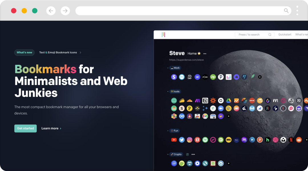 Superdense是一個在線書籤平臺,推薦給喜歡分區的朋友們,可以做到如截圖所示的書籤管理效果。