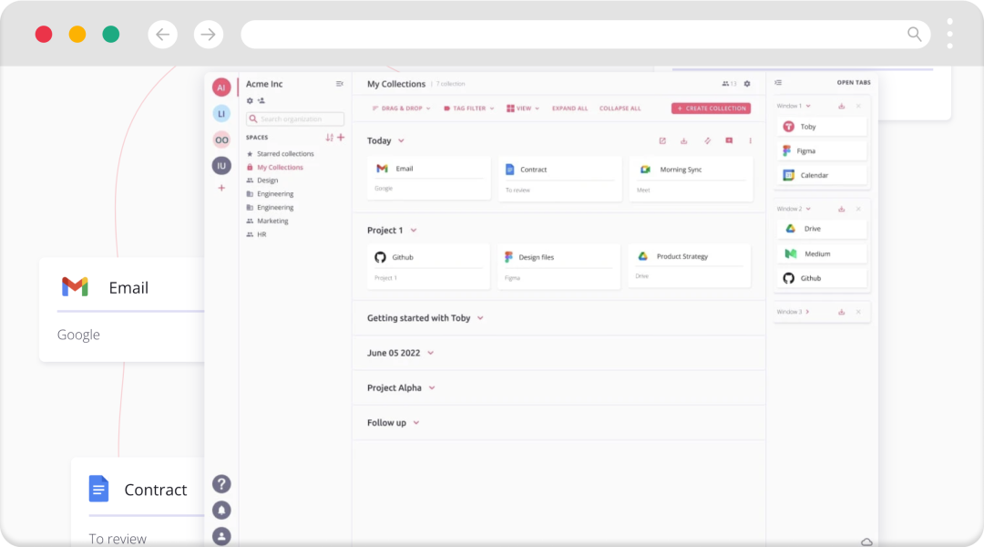 Toby 是一款基於瀏覽器擴展的書籤管理工具,可以將多個瀏覽器選項卡整理成集合,方便用戶在不同選項卡之間快速切換。用戶可以將多個集合整合成一個項目,並且可以將不同項目保存在不同工作區間下,便於管理。