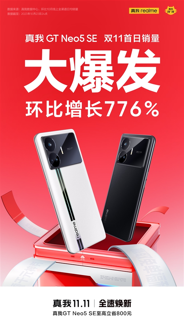 快科技10月25日消息,一年一度的雙11大促已經拉開序幕,真我公佈了雙11首日銷售業績:真我GT Neo5 SE銷量環比增長776%。