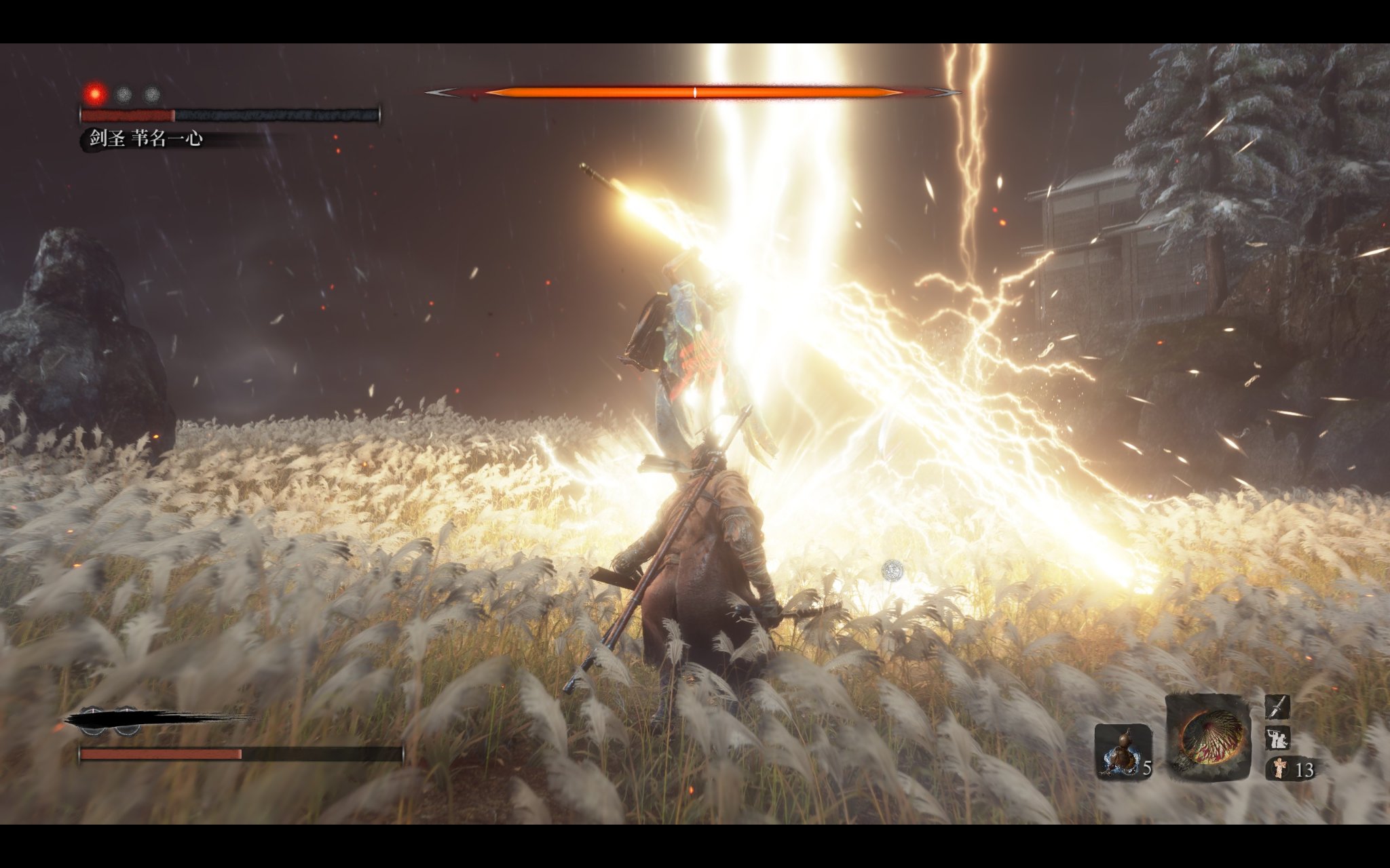 進入三階段,葦名一心會開始使用巴之雷,此外沒有什麼新的招式,而巴之雷算是一個純純白給的招式,所以三階段的葦名一心是弱於二階段的,但由於二階段基礎太強了,所以三階段葦名一心也不是喫素的