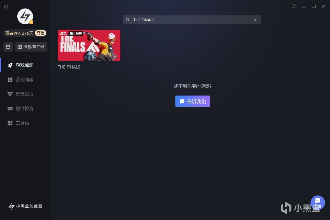 ②贴出在小黑盒加速器中加速《The Finals》的截图(如下图)