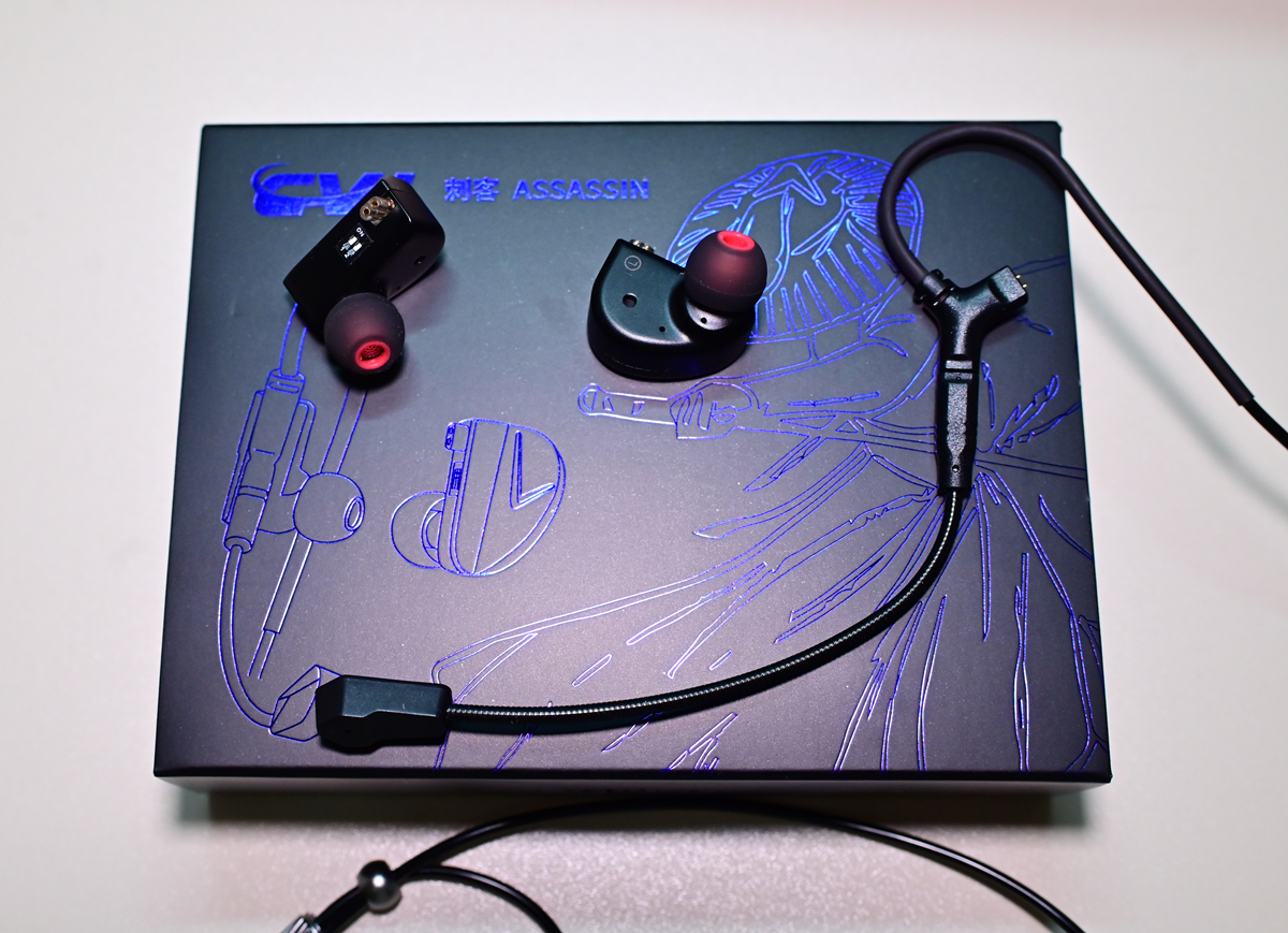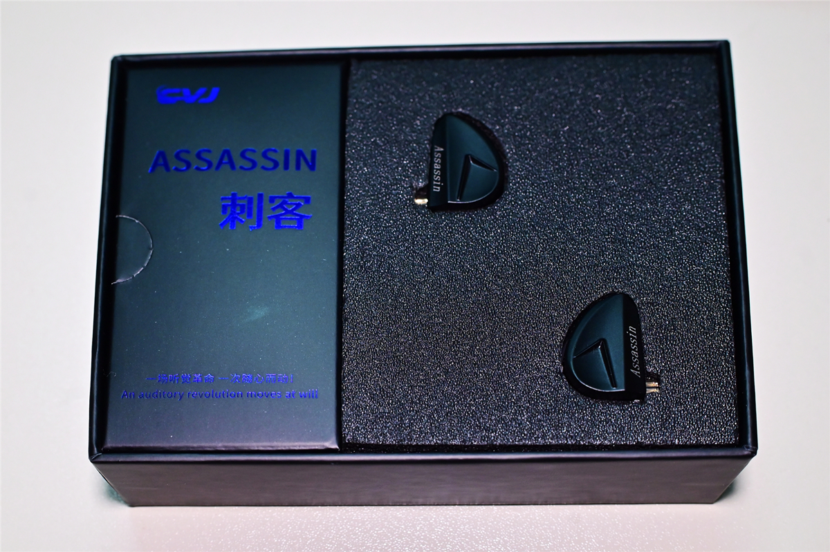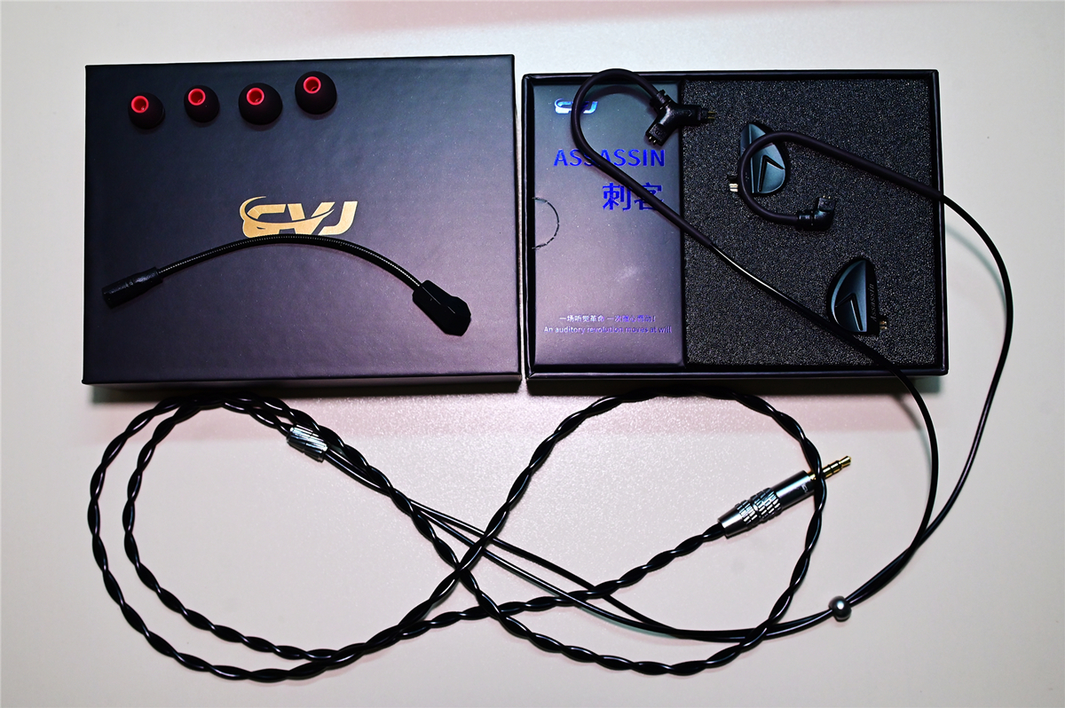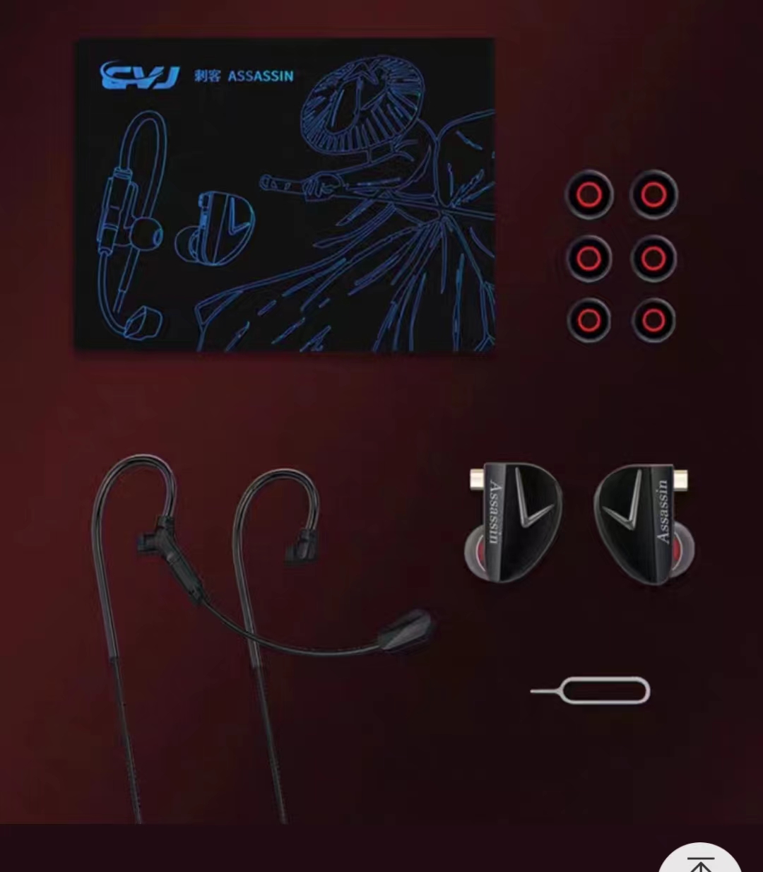 外包裝一如既往的風格化,以黑色爲底,用藍色勾線出了耳機的線材、耳塞和一個國風俠客形象,如產品名”刺客“。打開天地盒後,防撞泡沫包裹着一對耳機單元,這耳塞上的”>"標誌是在致敬”√“嗎?除了自帶的3.5mm耳機接口外,“CVJ 刺客”附贈了type-c和micro-USB轉接口,適用於電腦、手機和音樂播放器等各種設備。