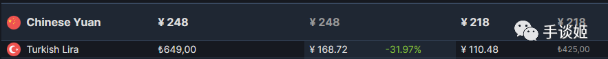 当然,手谈姬觉得如果你真的账号在阿区或者土区也不必非常悲观,即便游戏使用美元定价,也不意味着就会贵,举个例子,同样的游戏,美区卖40美元,国区卖200人民币,阿区卖20美元,那阿区依然是便宜的。