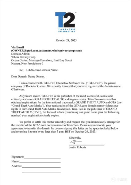此外,据爆料称,Rockstar Games 的母公司 Take-Two Interactive 目前正在积极获得GTA6.COM域名的所有权。爆料者 KYE 在 X 平台(原Twitter)上声称,Take-Two Interactive 已经向域名所有者公开发送了法律信函,要求域名所有者将域名转移到 Take-Two 名下。